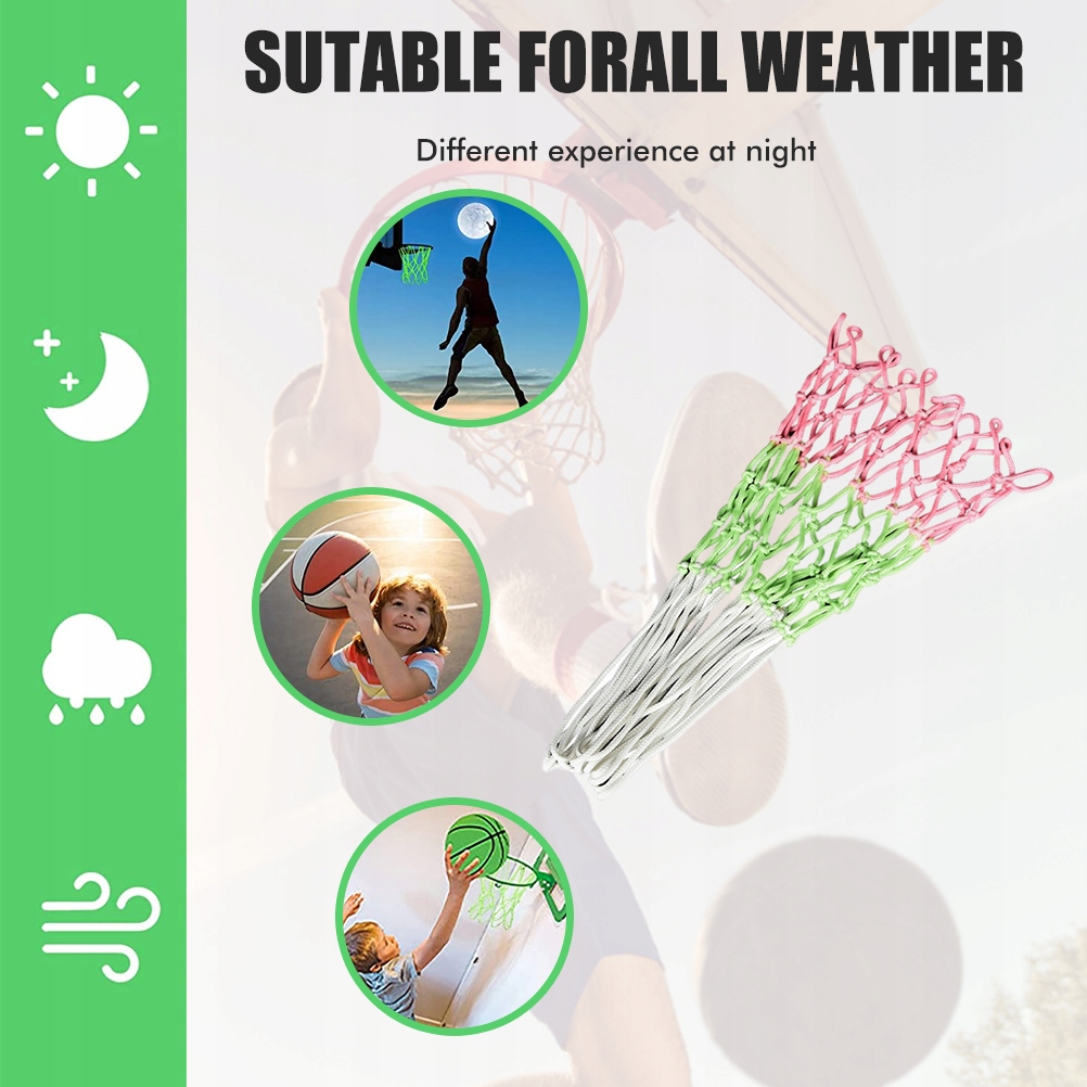 1. 1. Хорошая видимость в ночное время: эта баскетбольная сетка из полиэстера может поглощать солнечный свет в течение дня и светиться в темноте, что позволяет вам играть даже ночью. Соотношение времени поглощения света и времени флуоресценции составляет около 1:3, а самое продолжительное время флуоресценции составляет около 5 часов. 2. 2. Превосходная стойкость к истиранию и долговечность: для повышения долговечности эти сверхпрочные баскетбольные сетки изготовлены из полиэстера, подходящего для любых погодных условий, очень толстого и прочного, поэтому они могут выдерживать большие нагрузки во время использования. Его можно использовать в различных погодных условиях. 3.3. Трехцветный дизайн: наша всепогодная баскетбольная сетка имеет трехцветный дизайн (белый, зеленый, розовый), который можно отличить от традиционных одноцветных баскетбольных сеток, что добавляет баскетбольной площадке веселья и креативности. 4.4. Идеально подходят для стандартных баскетбольных колец с 12 кольцами. Наши баскетбольные сетки с подсветкой рассчитаны на стандартные 12 и 6 узлов и могут использоваться со всеми типами стандартных баскетбольных колец, их очень легко собрать, они не требуют особых усилий или погодных условий. 5. 5. Не мешайте игре: ударопрочные баскетбольные сетки для помещений и улицы обеспечивают гибкость игры и не запутываются, что позволяет вам продолжать игру в баскетбол.