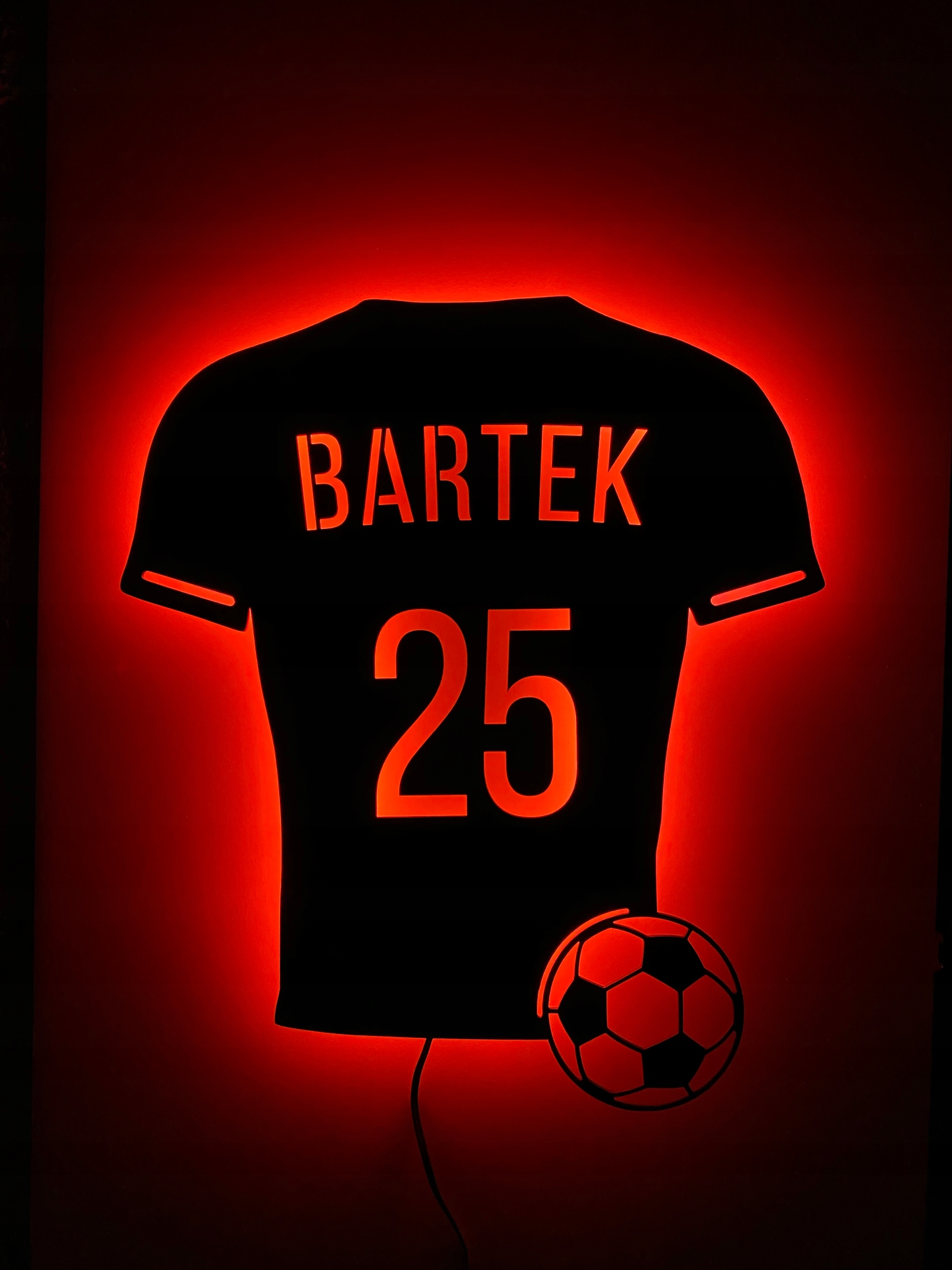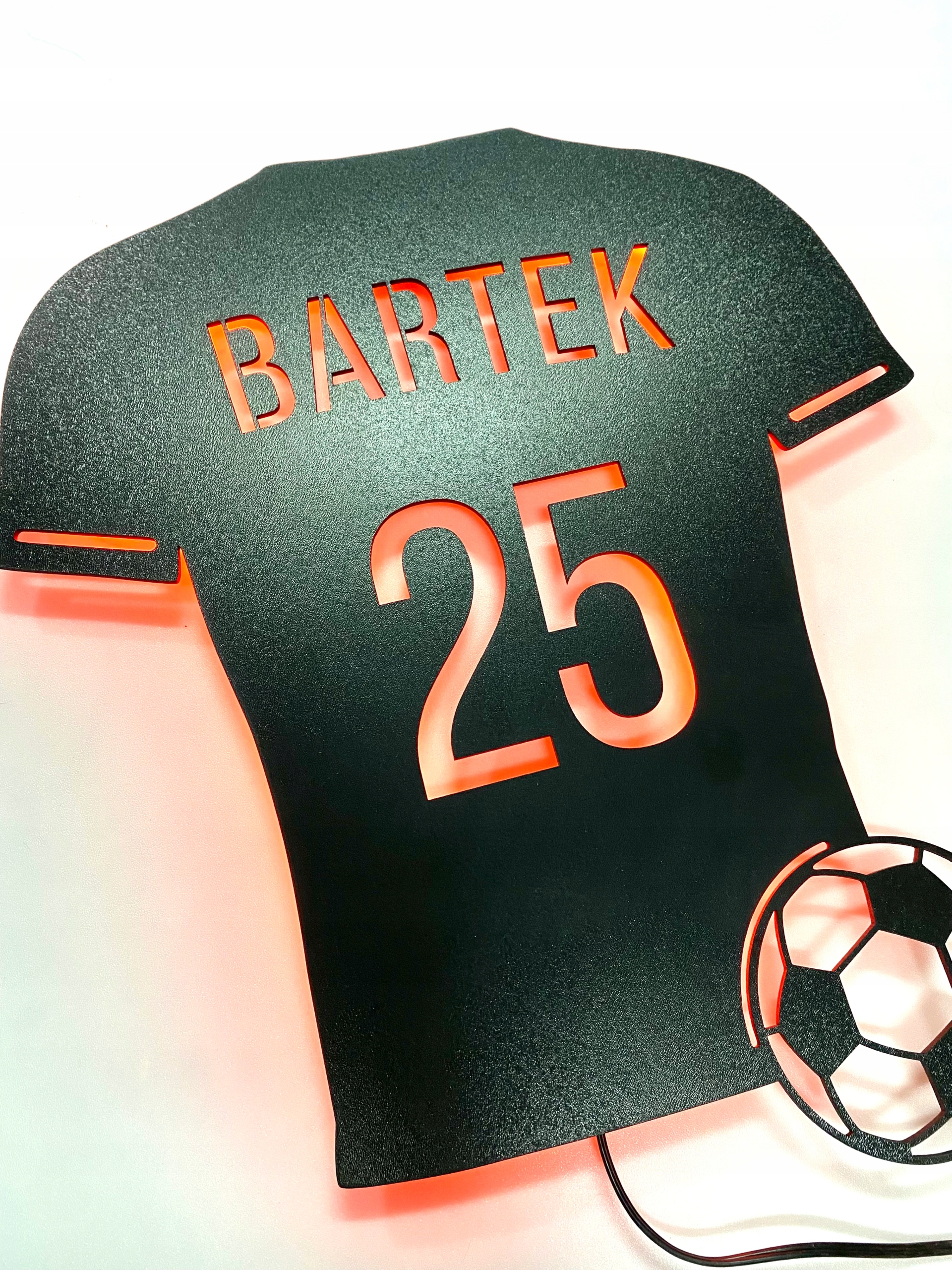 Спортивная футболка с подсветкой и выбранным именем и номером – настоящий хит! Дети любят футбол во всех его проявлениях! Маленькие любители футбола будут в восторге от красивого оформления своей комнаты!