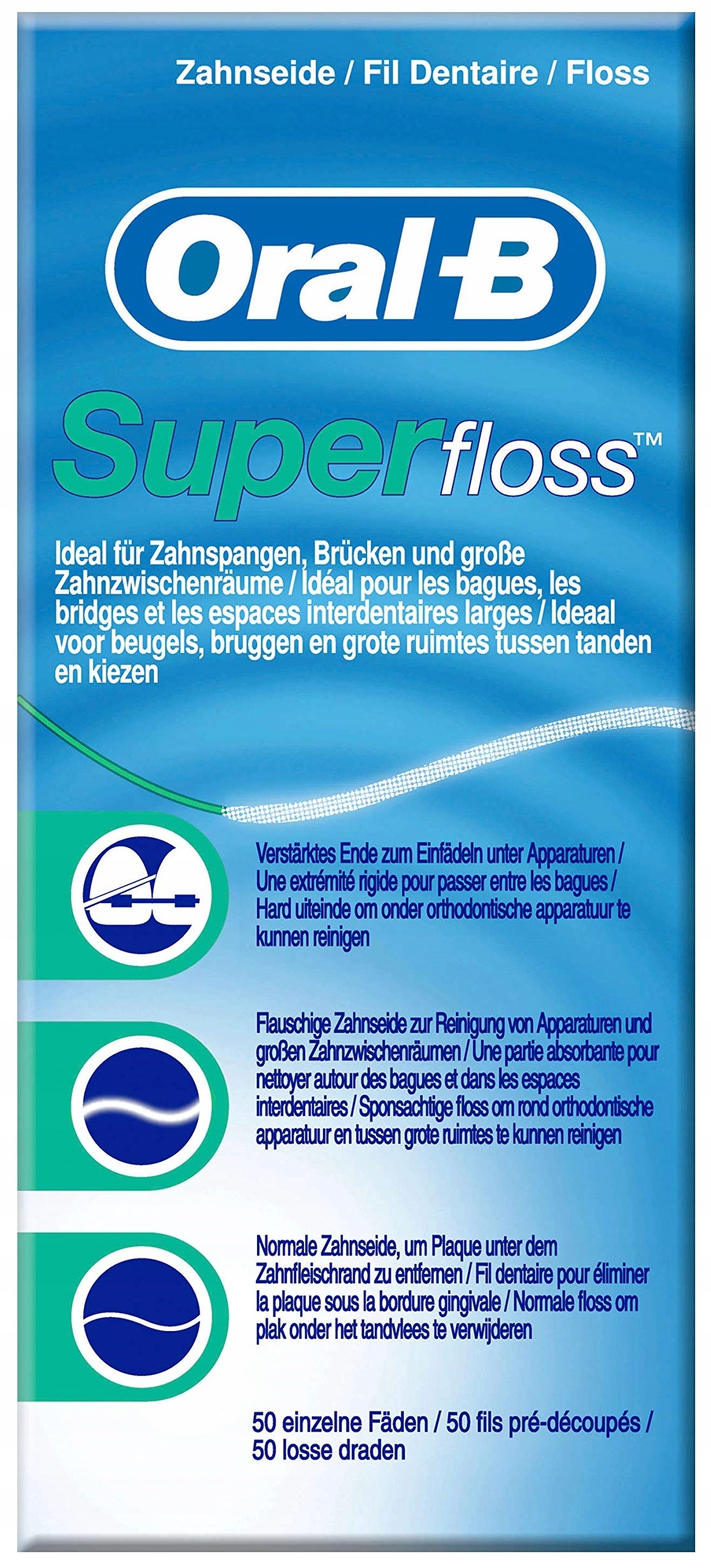 Зубная нить Oral-B Super Floss идеально подходит для чистки ортодонтических брекетов, мостов и больших межзубных промежутков.
