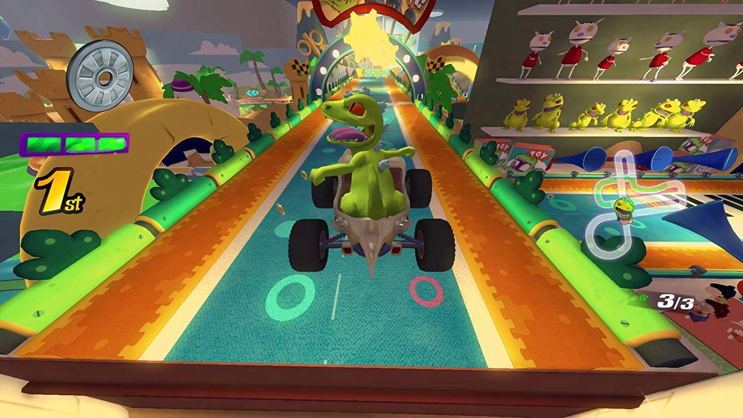 Путешествуйте по заполненным слизью гоночным трассам в Nickelodeon Kart Racers! и Анжелика, Томми и Рептар из «Ох уж эти детки». Соревнуйтесь с друзьями в локальном многопользовательском режиме для 4 игроков или испытайте себя на боевой арене, выполняя ряд испытаний.