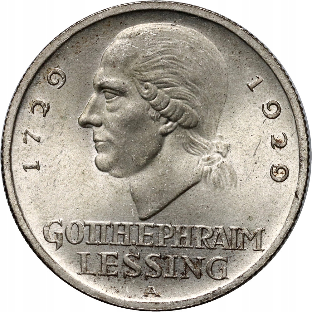 Niemcy, Weimar, 3 marki 1929 A, Gotthold Lessing. Pięknie zachowane.