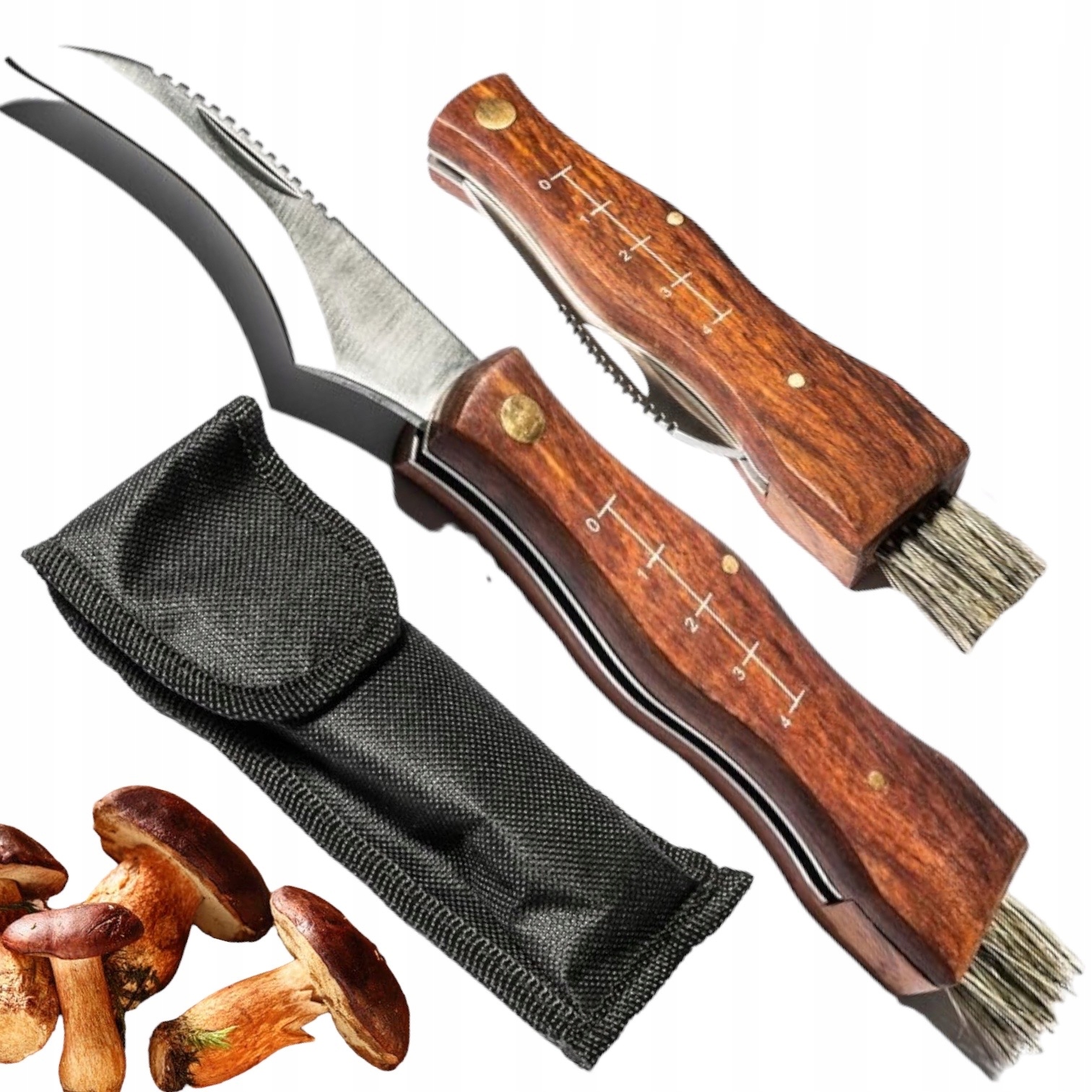 Складной нож из нержавеющей стали и дерева - дополнительно оснащен щеточкой, благодаря которой можно легко и эффективно очистить найденный гриб, и мерным стаканчиком для измерения улова. Нож дополнительно упакован в футляр. Складной нож имеет исключительно острое лезвие с вогнутым, даже серповидным лезвием. Это изогнутое лезвие идеально подходит для нарезки грибов, трав, растений, фруктов и т. д.