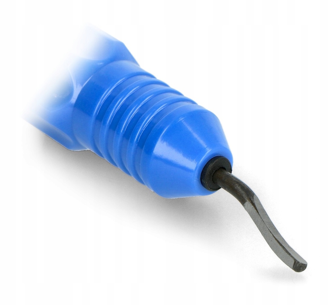 Нож предназначен для обработки 3D отпечатков. Имеет профилированные сменные лезвия, изогнутая форма которых облегчает доступ даже к труднодоступным деталям модели. Вращающийся наконечник облегчает манипулирование лезвием во время работы. Использование ножа значительно улучшает выравнивание краев отпечатков из нити. В комплект входят 10 запасных лезвий.
