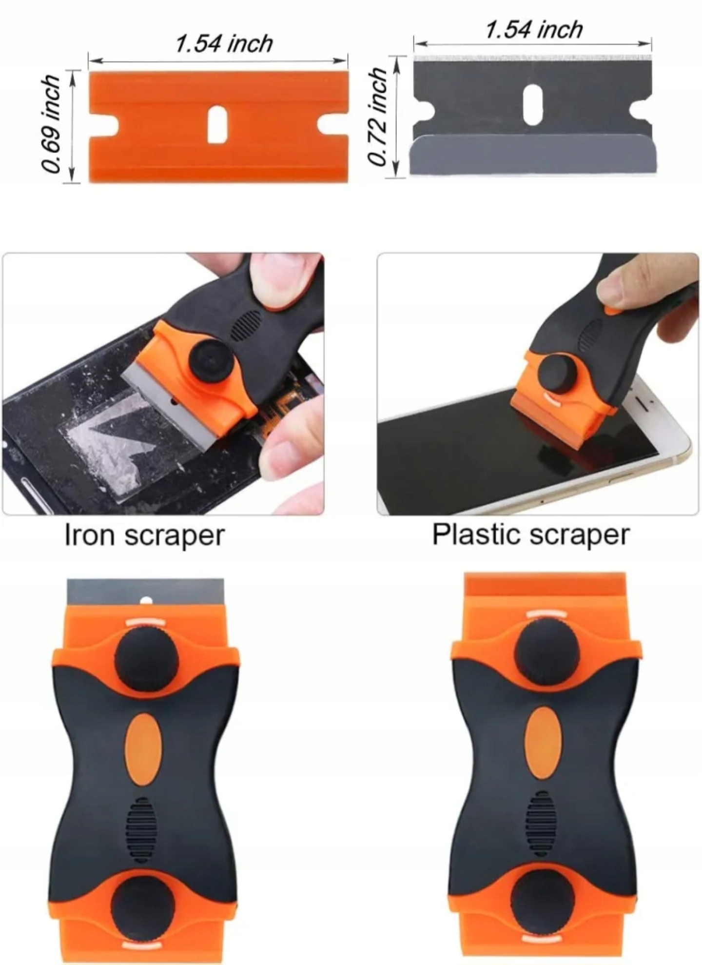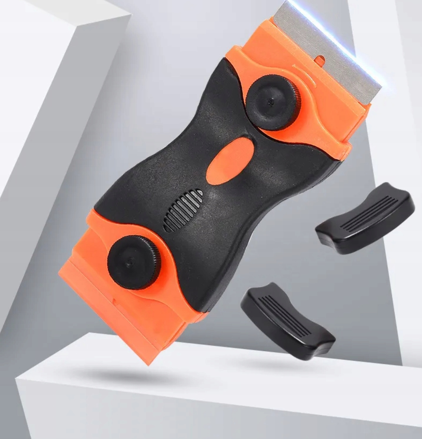 Универсальный скребок, удобная ручка, 3 дополнительных сменных лезвия в комплекте.