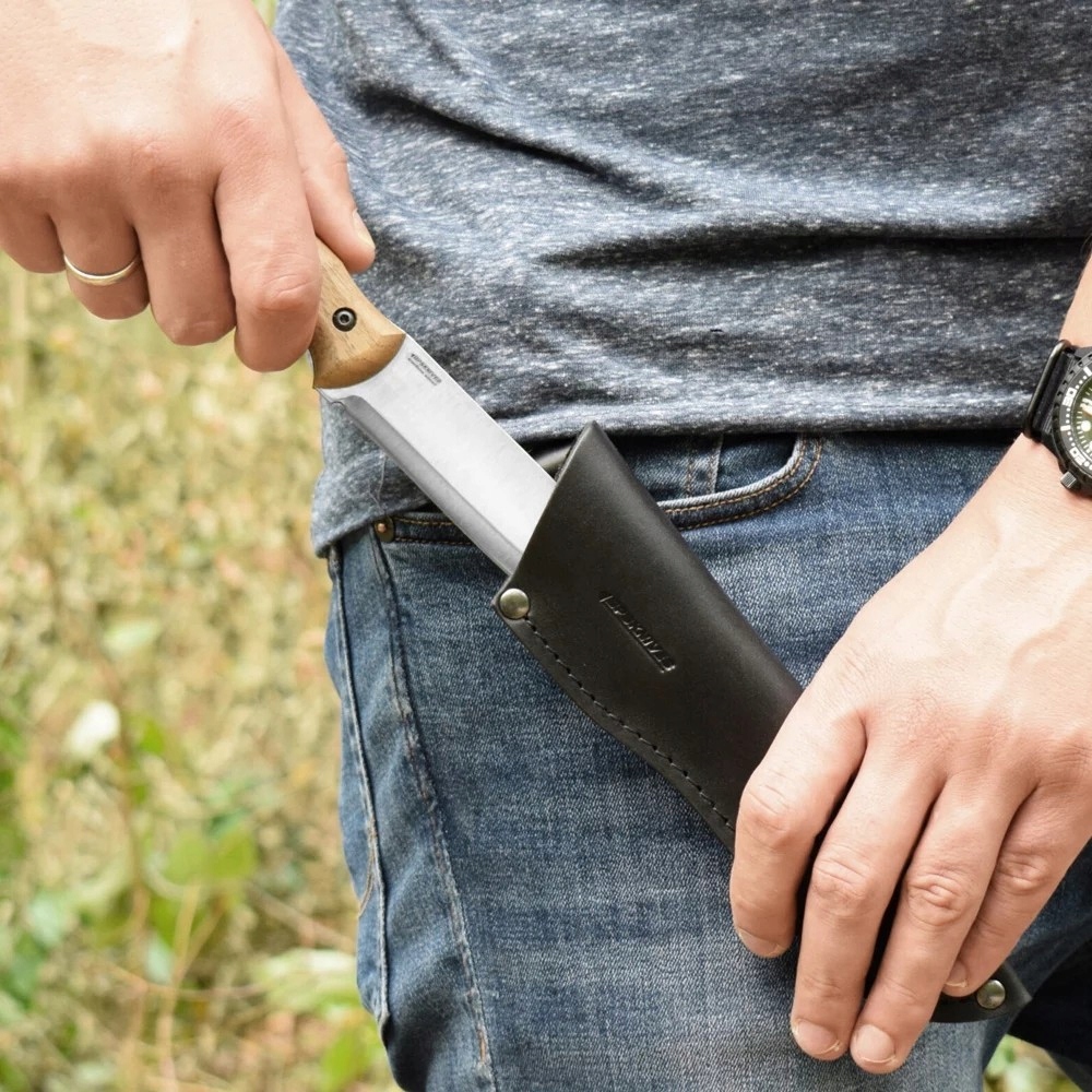 <ул> <ли> Лезвие Drop Point из углеродистой стали 1066: Нож имеет лезвие Drop Point, которое идеально подходит для различных задач, от резки до точных работ. Углеродистая сталь 1066 отличается высокой прочностью и легкостью заточки. Сатиновая отделка добавляет лезвию элегантности, а полный скандинавский крой делает нож идеальным для тяжелой походной работы. <ли> Цельная конструкция Tang: Нож изготовлен из цельного куска стали, что обеспечивает максимальную прочность и стабильность. Конструкция с полным хвостовиком означает, что стальная часть лезвия проходит по всей длине рукоятки, что повышает устойчивость к механическим повреждениям. <ли> Рукоятка из орехового дерева. Накладки рукоятки изготовлены из орехового дерева, которое традиционно используется в уличных ножах из-за его долговечности и эстетики. Рукоять обработана датским маслом, которое защищает древесину от влаги и грязи. Дополнительно в рукоятке имеется отверстие для веревки, а ее конец можно использовать как молоток или молоток. <ли> Кобура: В комплект ножа входит кобура из высококачественной черной кожи. Кобура усилена строчкой и заклепками, что обеспечивает долговечность и безопасное хранение ножа. Кобура крепится к ремню в вертикальном положении, что облегчает доступ к инструменту и обеспечивает его устойчивость.Приложение: