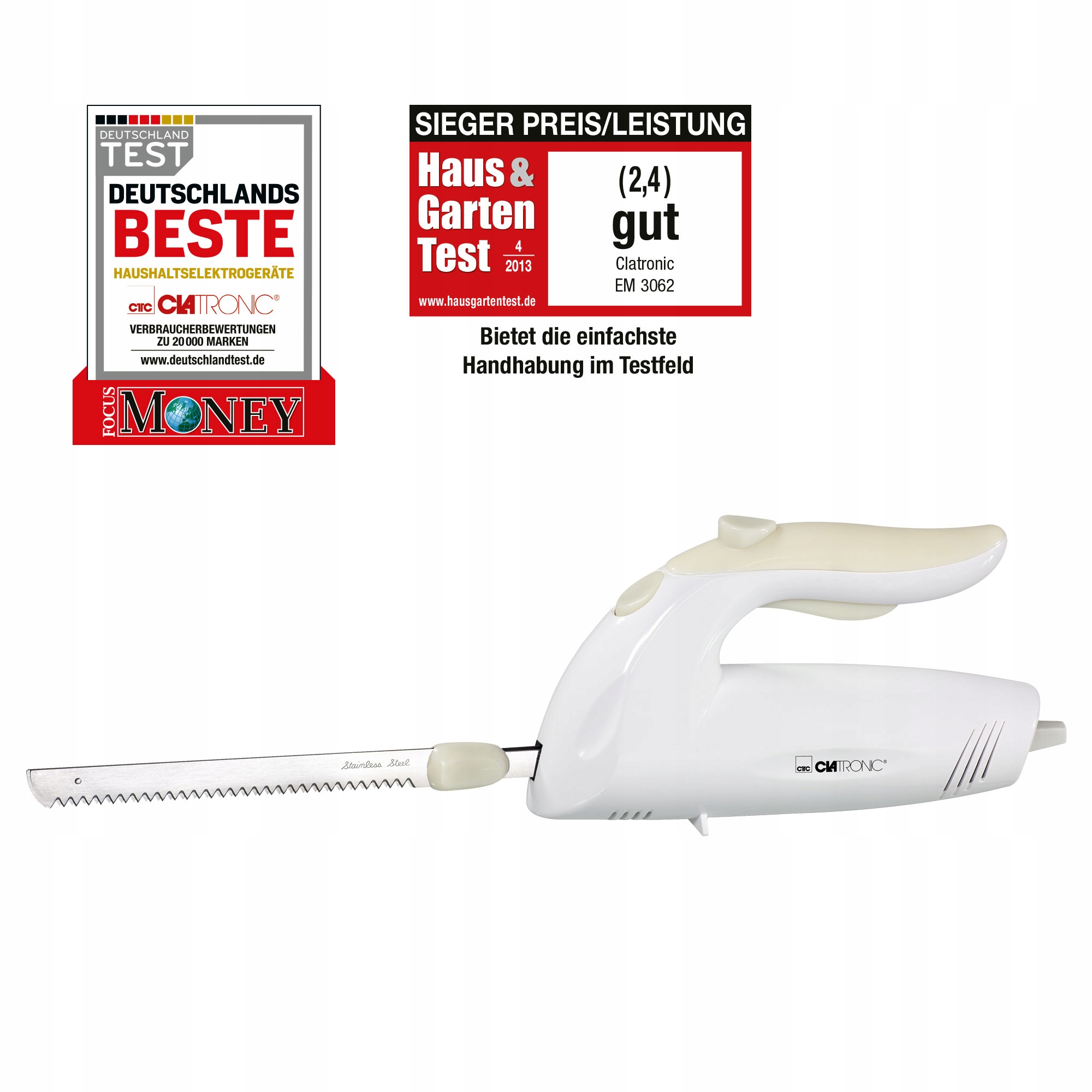 Clatronic EM 3062 — тихий прибор, его работа не создает неприятных вибраций. Нож безопасен в использовании – у него есть предохранительный выключатель и кнопка освобождения лезвия.