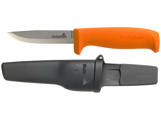 Нож «Hultafors» для ручной работы с лезвием толщиной 2,5 мм из углеродистой стали, закаленной до 58-60 HCR. Клинок полируется в несколько этапов с окончательной шлифовкой на кожаном диске. Рукоятка и ножны изготовлены из чрезвычайно ударопрочного полипропилена. Уникальное решение, позволяющее повесить ножны на пуговицу костюма, не опасаясь отстегивания, при этом обеспечивая легкое снятие. Версия с ножнами
