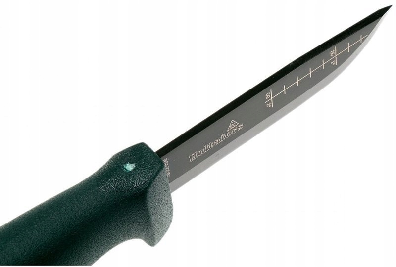 Головка ножа Hultafors OK1 покрыта специальным черным электроферическим покрытием (EPD), которое не только твердое, но и защищает нож против коррозии и устраняет блики света. На лезвии указана практичная мера (сантиметры и дюймы).