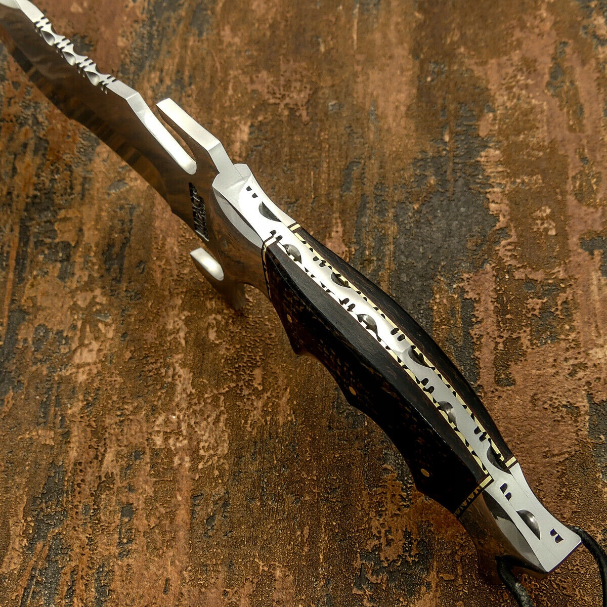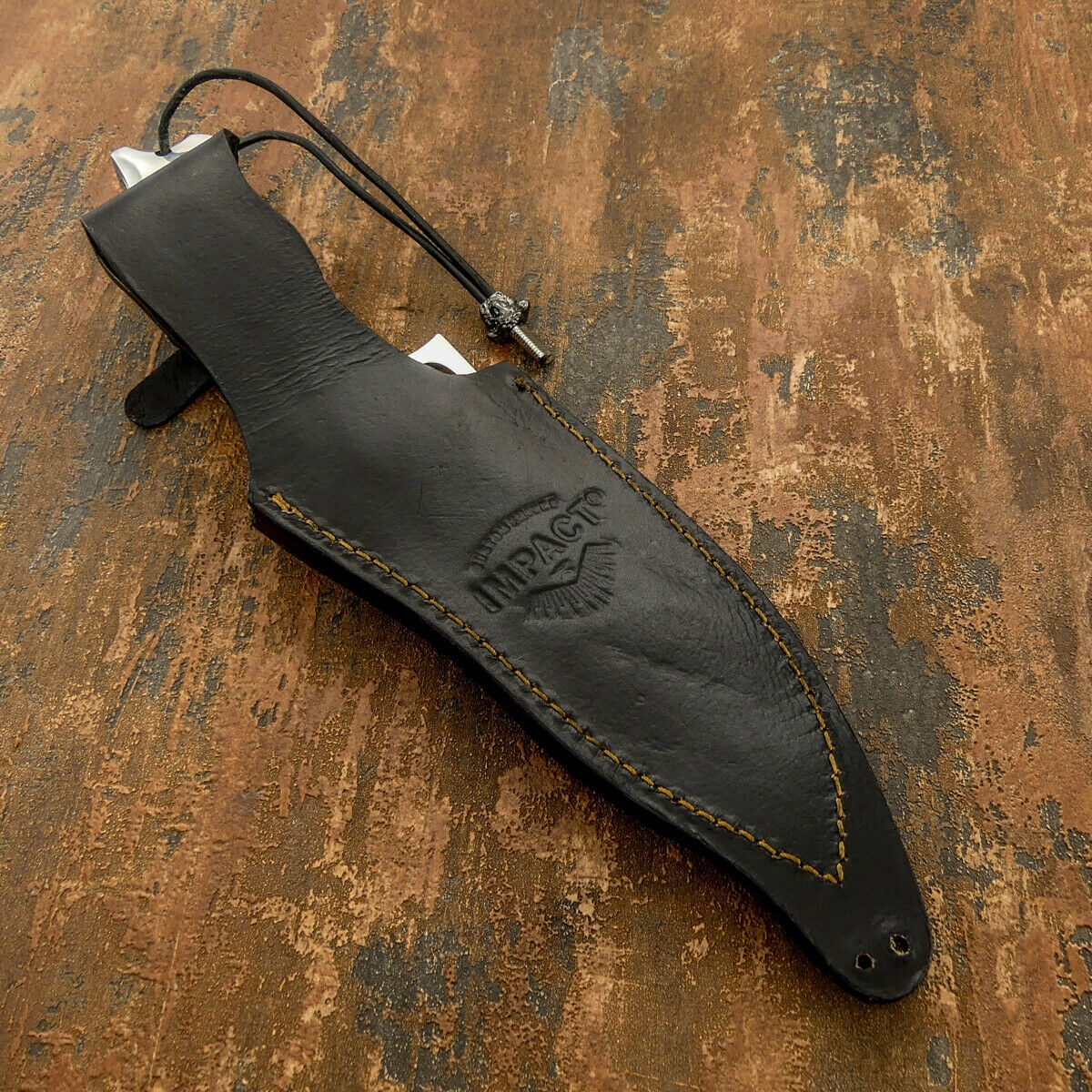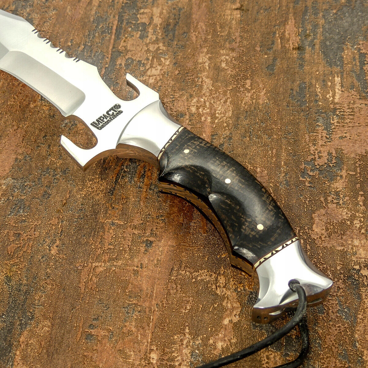 Лезвие: Типа Боуи, имеет вогнутый срез, отлично подходит для резки, острый как бритва, но срез достаточно массивный, чтобы рубить не было проблемой. Изготовлено из инструментальной стали D2, закалено примерно до 60 HRC, на лезвии имеется подпись производителя Impact,