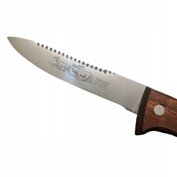 Нож охотничий с фиксированным лезвием и деревянной ручкой. Лезвие на тыльной стороне имеет практичные крестообразные зубцы. Он изготовлен из нержавеющей стали. Клинок кованый и изготовлен из высоколегированной нержавеющей стали твердостью 56-58 HRC, что обеспечивает высокую прочность. На стыке лезвия и рукояти имеется гарда, предохраняющая руку от соскальзывания на лезвие.