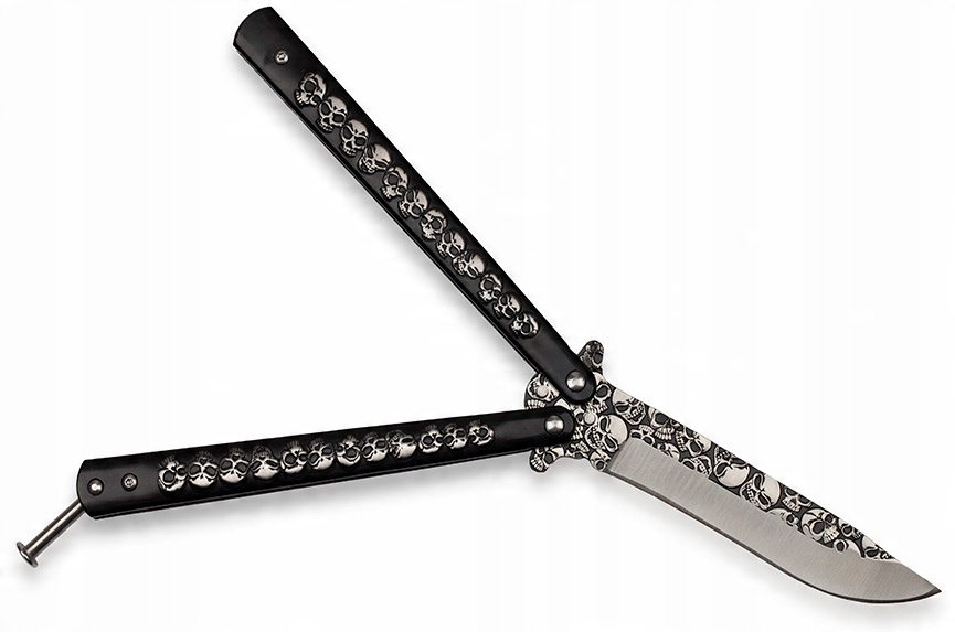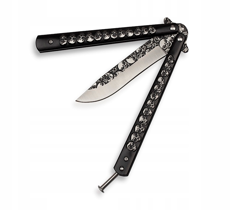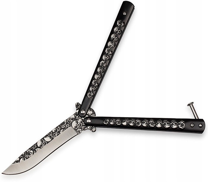 ⭐ Черная металлическая рукоять имеет классическую для ножей-бабочек форму.