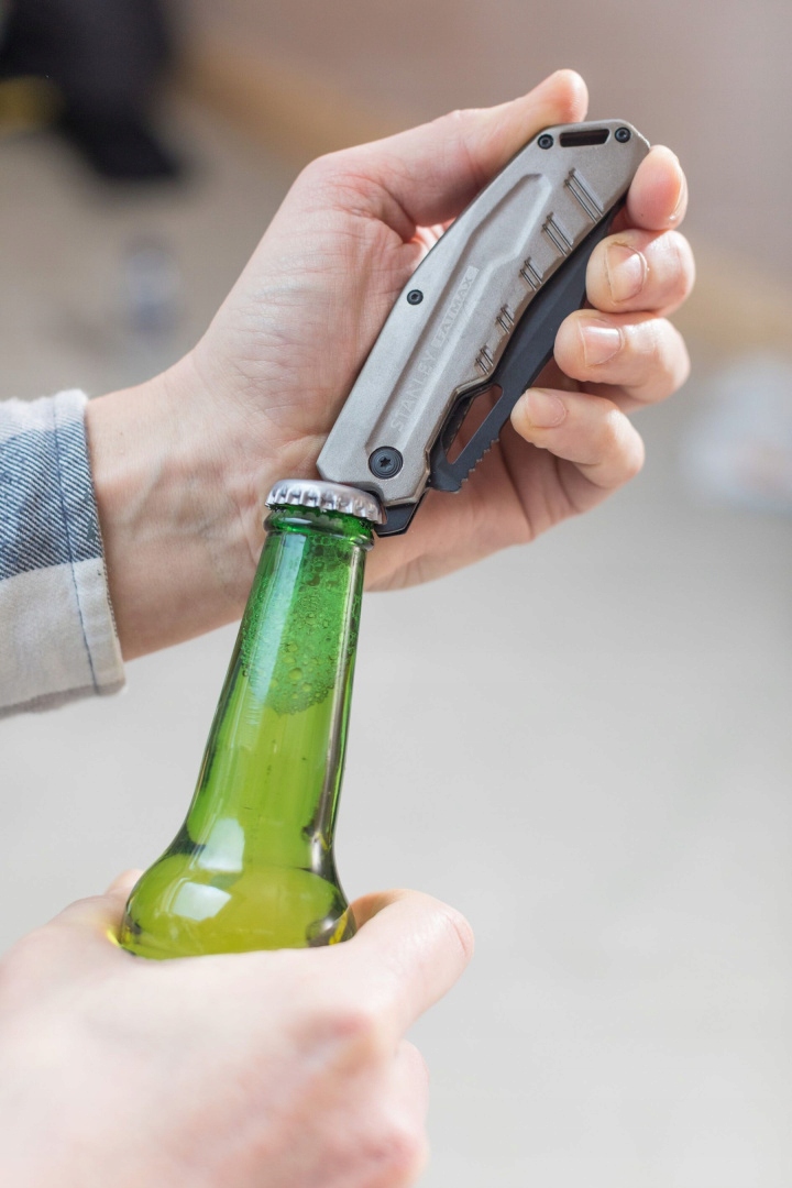 Тонкая, легкая, эргономичная ручка обеспечивает комфорт и контроль. Механизм блокировки втулки помогает зафиксировать лезвие в открытом положении. Встроенная открывалка для бутылок и скошенный край для различных применений.