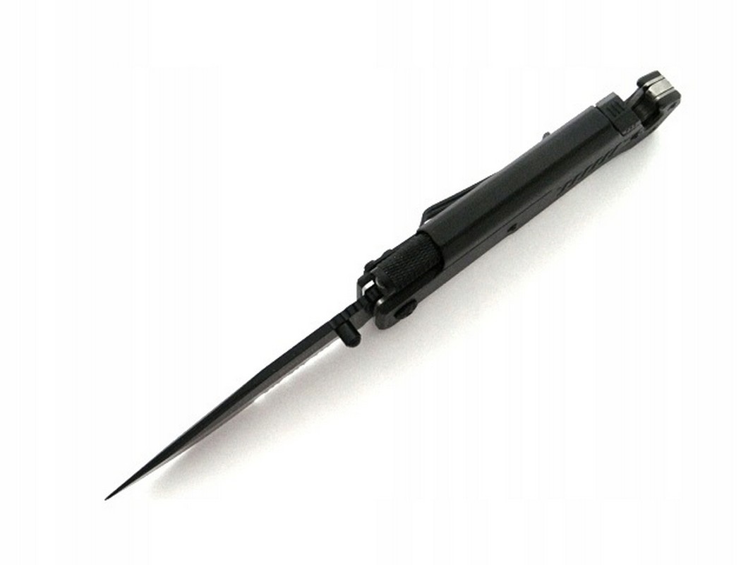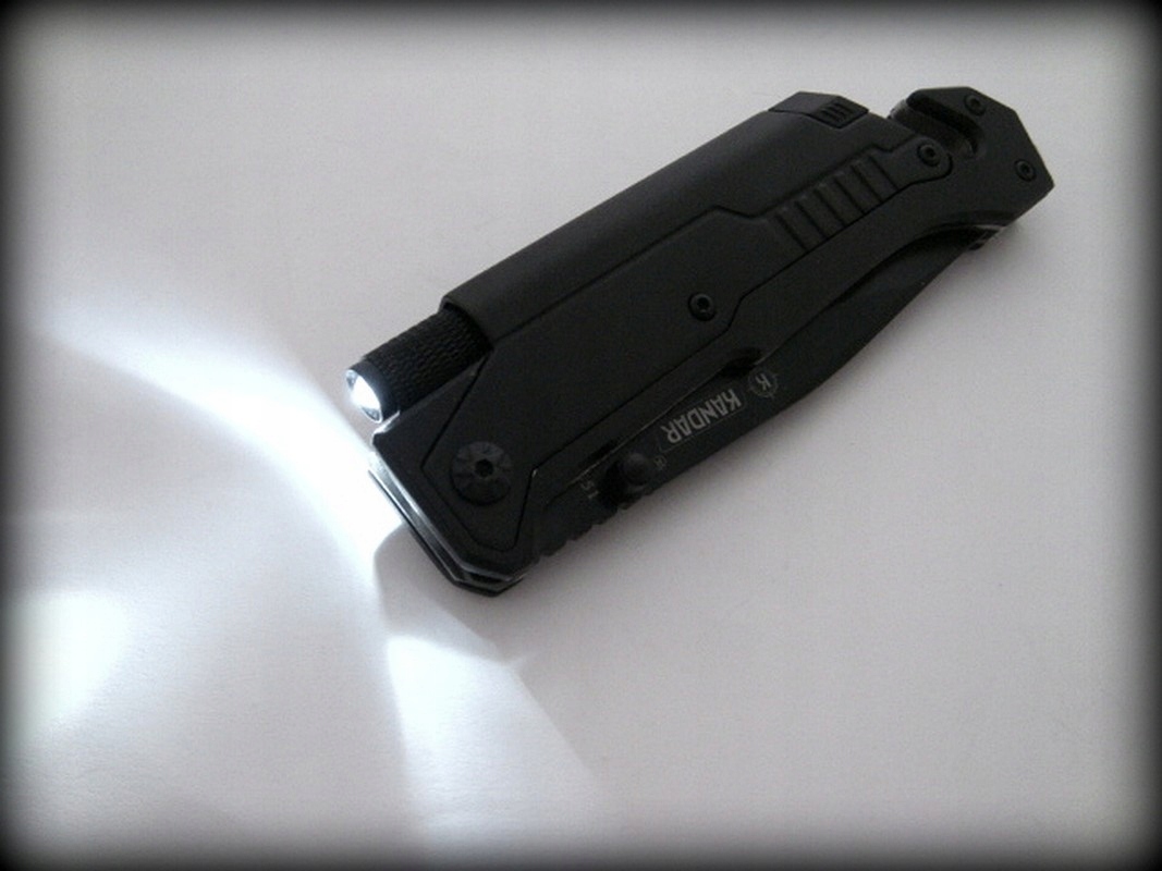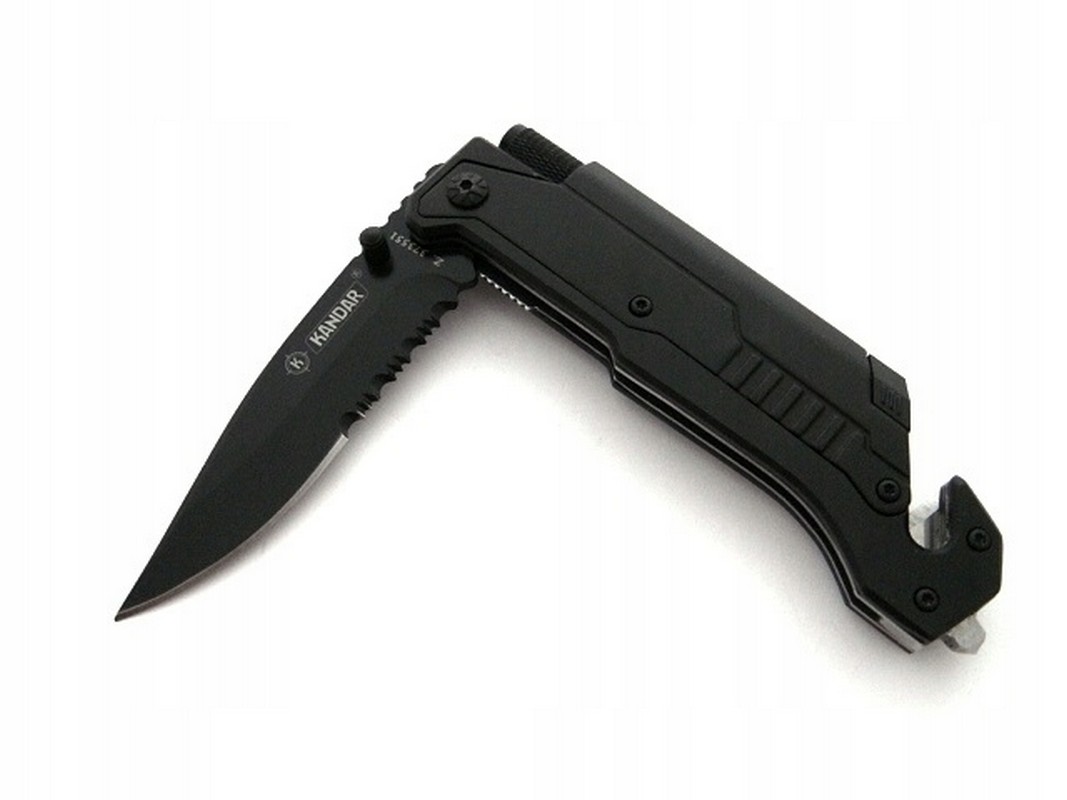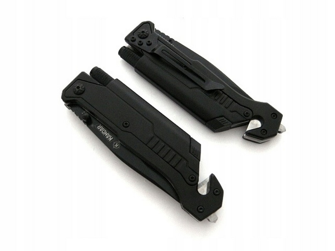 Многофункциональный нож от польской компании Kandar. У него есть зазубренное лезвие, большой стеклобой и дополнительное лезвие для разрезания ремней, а также фонарик и зажигалка. Нож открывается с помощью штифта, установленного на лезвии. Имеет замок лезвия Liner-Lock. На задней части ножа имеется клипса для ношения на ремне. Нож новый и острый.