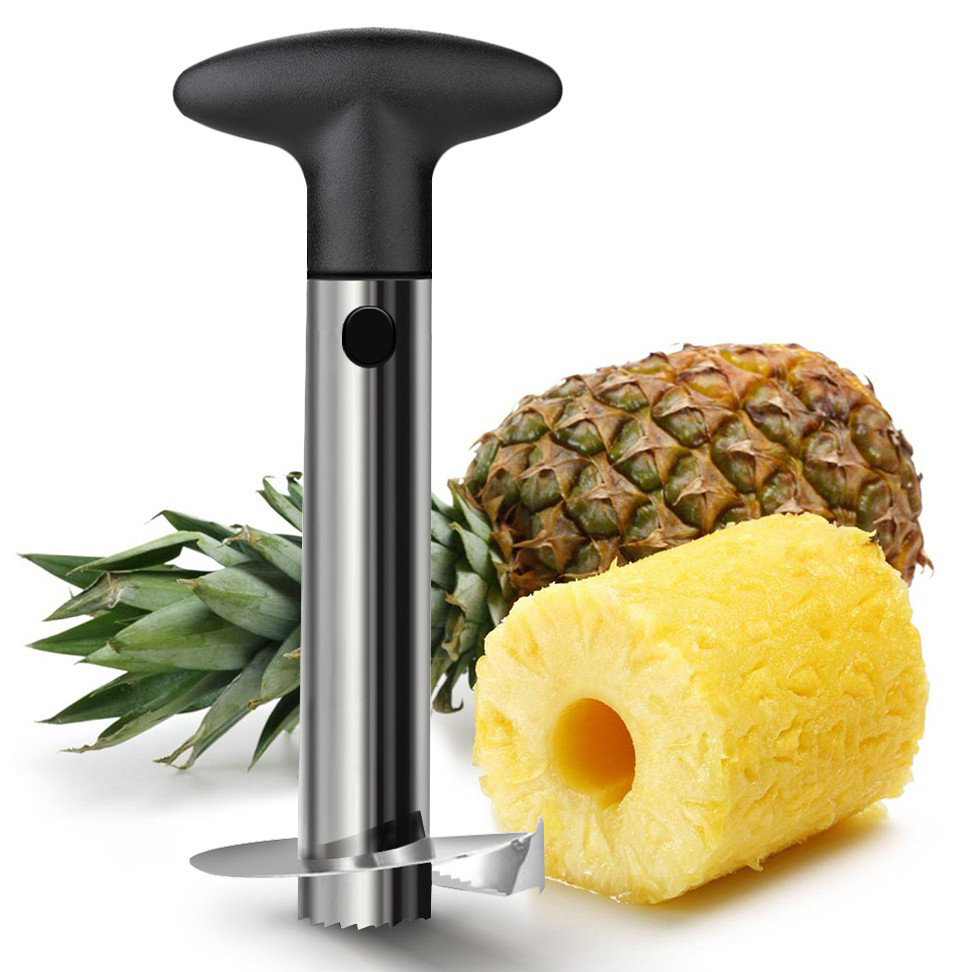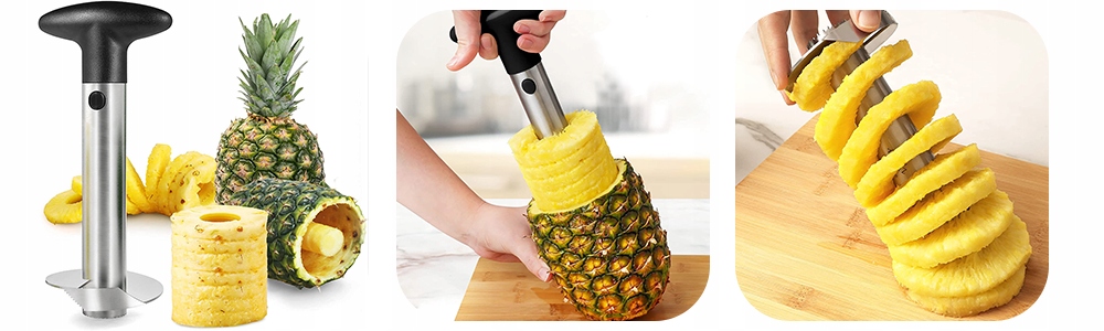 Слайсер из нержавеющей стали с пластиковой ручкой позволяет легко приготовить ломтики ананаса, без кожицы и твердой сердцевины. Легко и быстро врезается штопором в плоть.