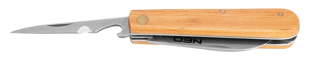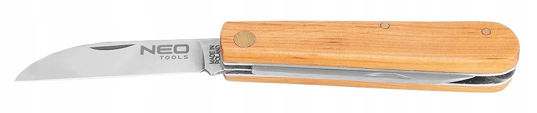 Надежный монтажный нож с шампуром и деревянными накладками от бренда NEO. Цельный предмет польского производства с двойным лезвием имеет общую длину 170 мм. Он оснащен практичным замком, который предотвращает неконтролируемое открывание механизма. Один классический клинок, другой профилированный как нож и пробойник.