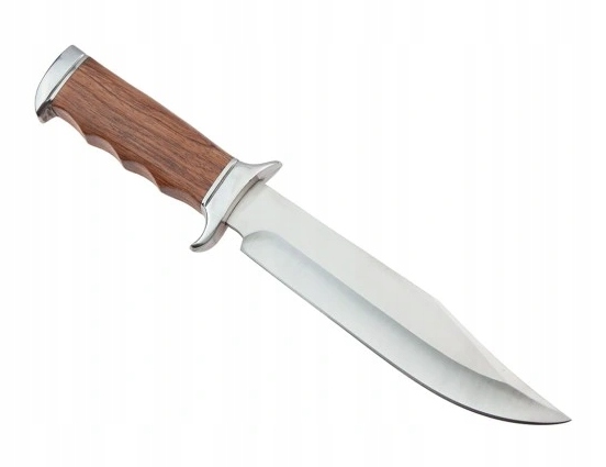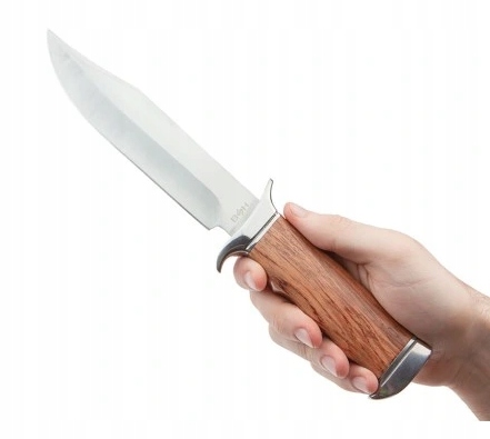 Крупногабаритный охотничий нож с рукоятью из твердой и прочной экзотической древесины. Лезвие толщиной 4 мм и длиной 185 мм изготовлено из нержавеющей стали. Гарда и затыльник приклада из нержавеющей стали также обеспечивают надежный захват даже в перчатках.
