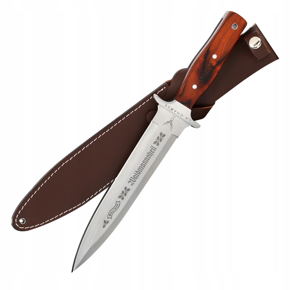 Клинок имеет двусторонний срез и пятно крови. На клинке выгравирован логотип Walther и традиционное охотничье приветствие "Waidmannsheil" (Darz Bór!).