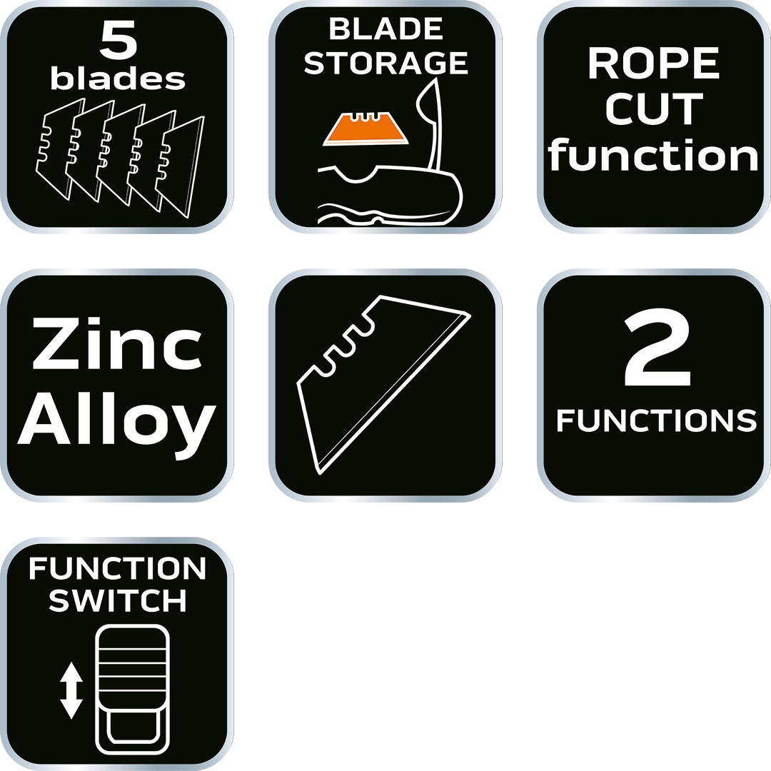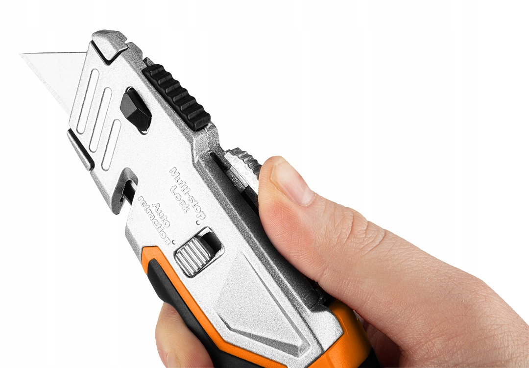 Складной нож с трапециевидным лезвием 1+5 лезвий 63-706 от NEO Tools – это нож, оснащенный 6 лезвиями. Он характеризуется фиксированным и безопасным лезвием (выдвижным и автоматическим). Благодаря легкому алюминиевому корпусу его вес очень мал. Нож NEO Tools имеет функцию резки линий и полосок. Благодаря встроенному в корпус магазину для запасных лезвий он подготовлен к интенсивной и многочасовой работе в различных условиях. Это инструмент со многими приложениями. Практичная проушина позволяет удобно прикрепить его к ремню или повесить на стену с инструментом.