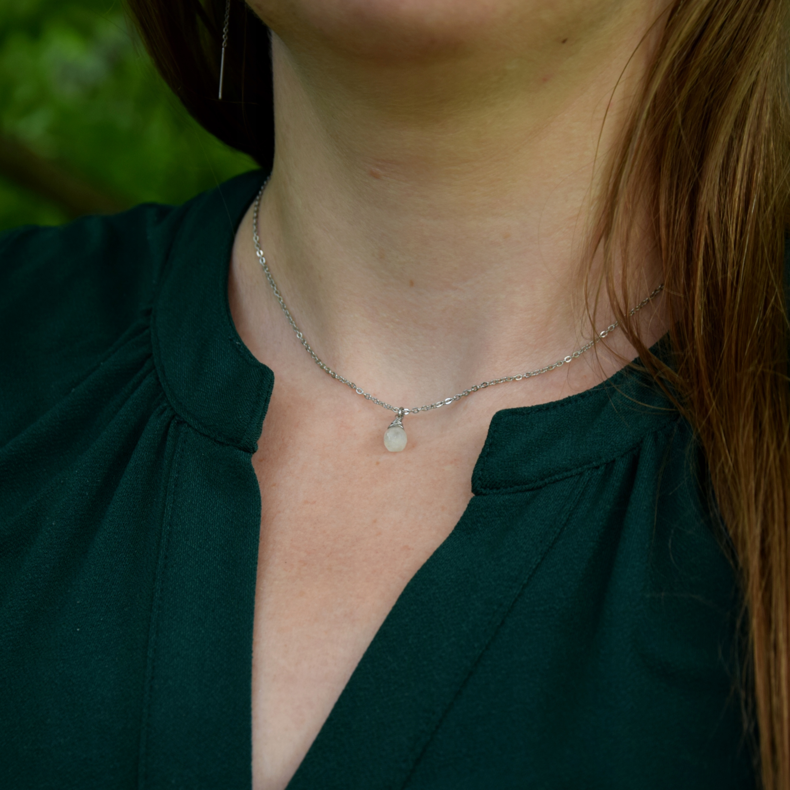 Минималистическое колье с ограненной каплей клубничного кварца, выполненное вручную в технике накрутки из проволок из хирургической стали. Ожерелье короткое, его можно носить на шее. Его длина 42 см. Общая длина кулона составляет 1,7 см. Размер капли кварца примерно 9х7 мм.