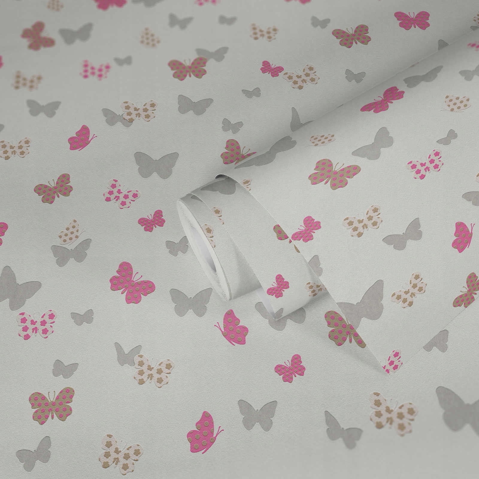 Современные обои с изображением пастельных бабочек розового и серого цвета на однотонном белом фоне.