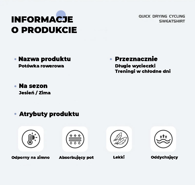 ИНФОРМАЦИЯ О ПРОДУКТЕ Название: Базовый слой из велосипедного флиса Материал: 92% полиэстер, 8% эластан. Сезон: Осень, Зима Особенности: легкий, быстросохнущий, дышащий, теплый. Значки функций: Дышащая ткань Мягкий на ощупь Гибкий Тепло