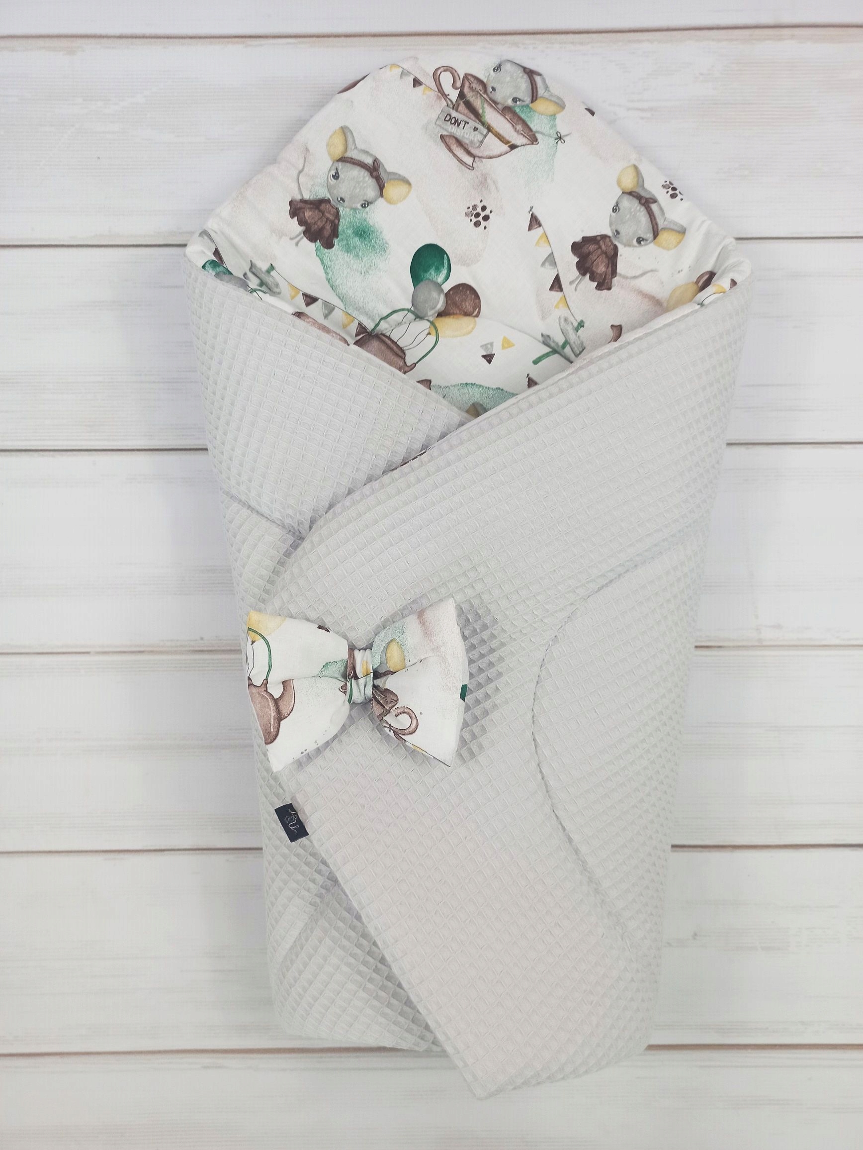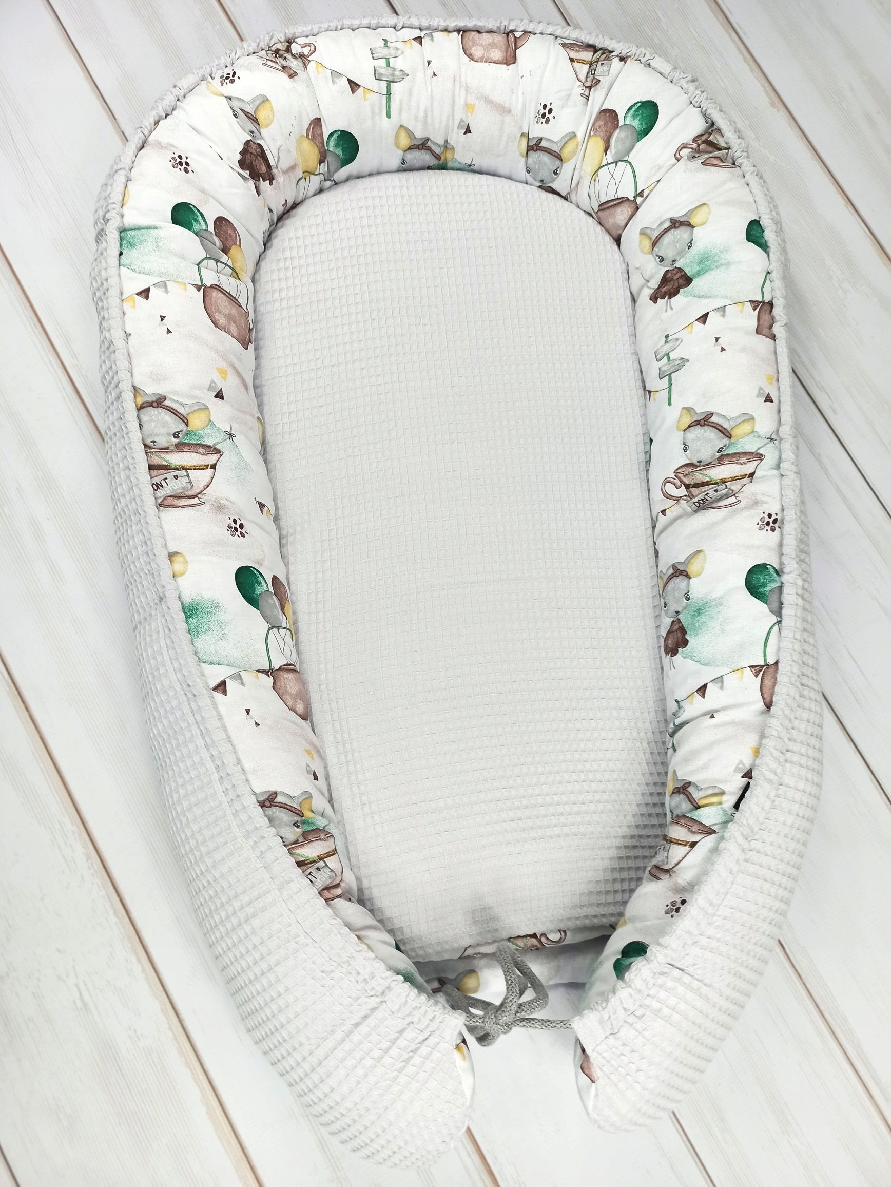 Кокон можно переворачивать по вашему желанию - на фото есть снаружи виден вафельный хлопок, а внутри гладкий хлопок с рисунком. Развязав шнурок, кокон можно вывернуть наизнанку. Благодаря этому вафля окажется внутри кокона, а рисунок снаружи.