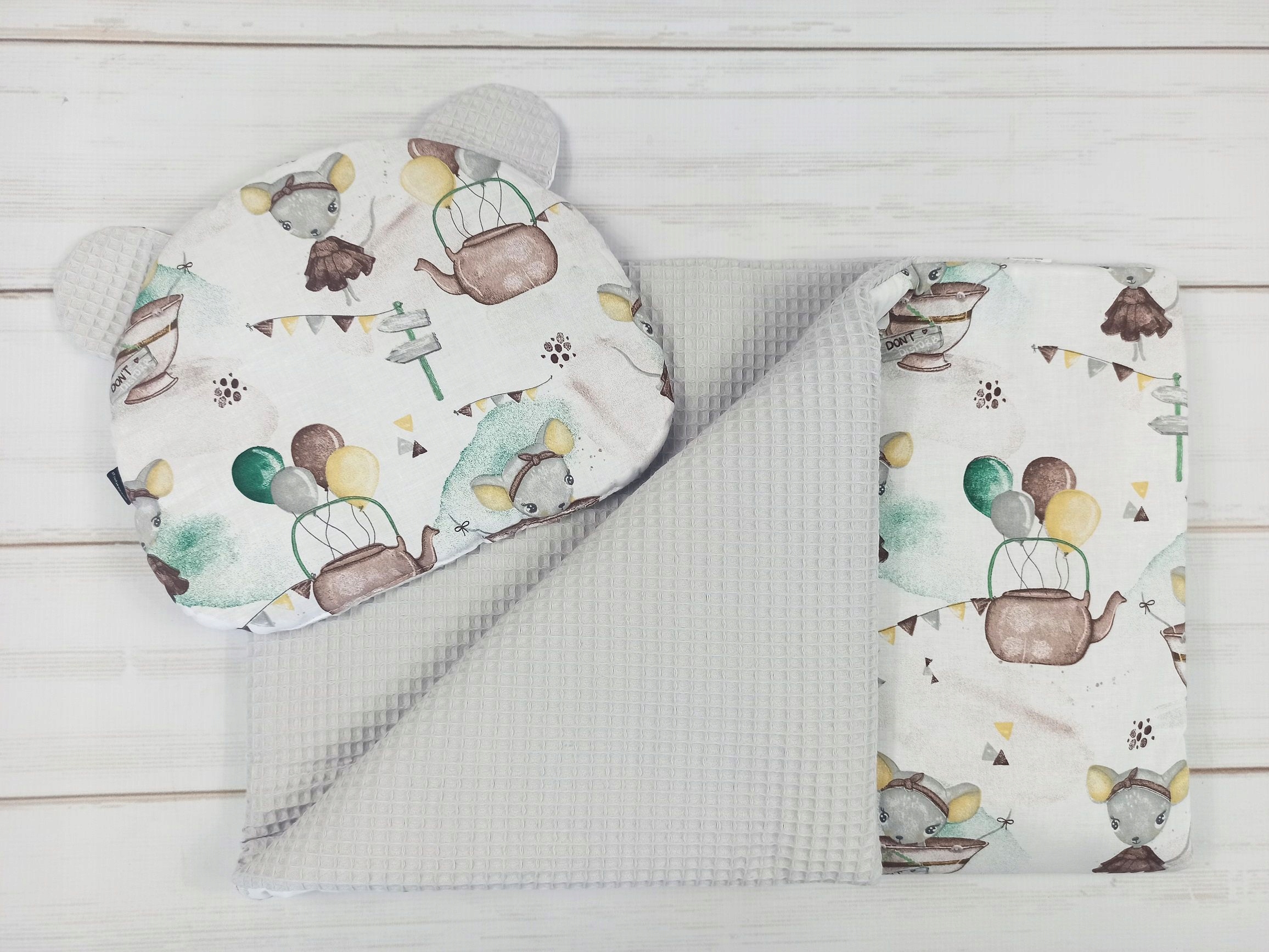 Конус двухсторонний - с одной стороны нежный материал (хлопок) вафельный, с другой стороны хлопок с красивым рисунком. Конус можно перевернуть так, чтобы рисунок оказался снаружи, а нежная вафля оказалась внутри.