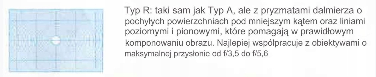 - type h - полный -экран, очень яркий микропризм; Он также не может оценить глубину резкости. Четыре версии (H1 - H4) для использования с объективом с определенным фокусным расстоянием. Предназначен для спортивной фотографии, но непопулярной, потому что изменение линзы может потребовать изменения экрана.