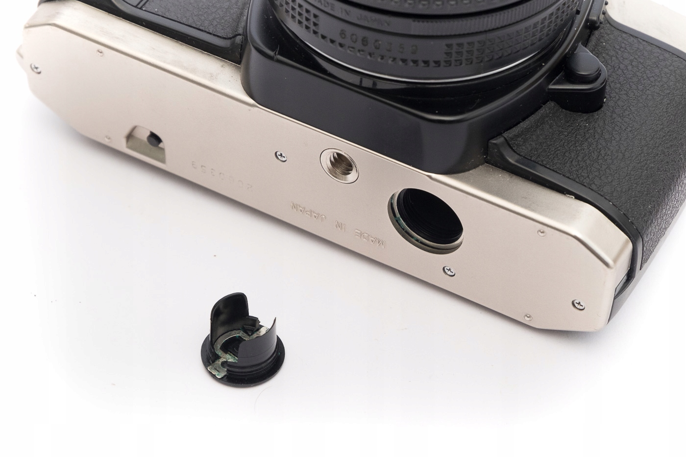 На задней стороне фотоаппарата, под заводным рычагом, маркировка «КГФО 1». видно на фотографиях.