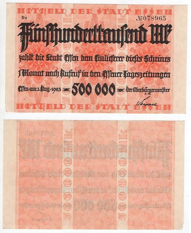 Просматривая «Германия / эссен 1923 500000» данный товар из каталога «Германия», вы можете получить дополнительную скидку 4%, если произведете 100% предоплату. Размер скидки вы можете увидеть сразу при оформлении заказа на сайте. Внимание!!! Скидка распространяется только при заказе через сайт.