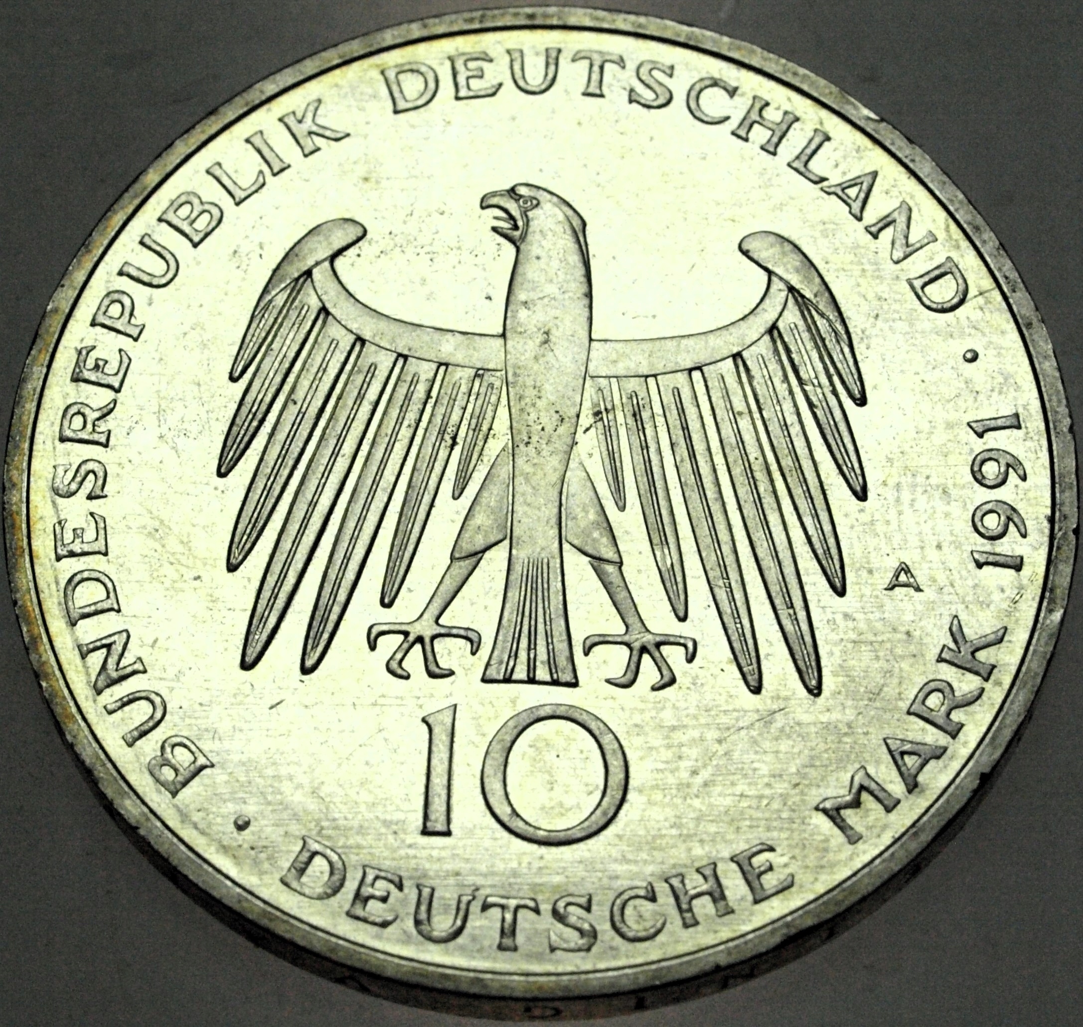 Німеччина 10 марок 1991 Бранденбурзькі ворота СРІБЛО