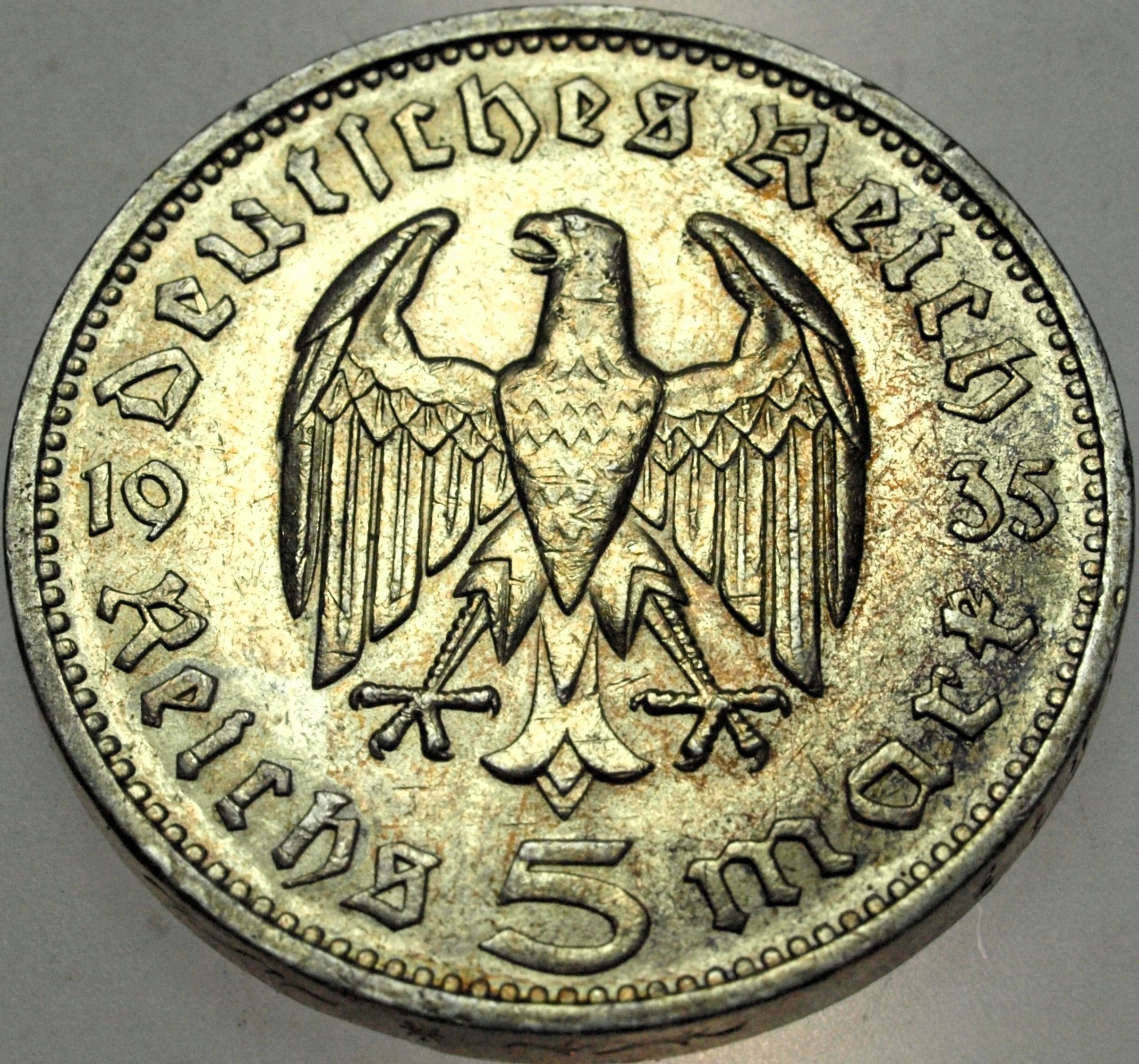 Германия, 5 марок Рейхсмарки 1935 года, Гинденбург, СЕРЕБРО. Оригинал. ПРОВЕРЬТЕ ДРУГИЕ АУКЦИОНЫ - СОБЕРИТЕ РЕДКИЕ ЦЕНЫ С NUMISMATO!