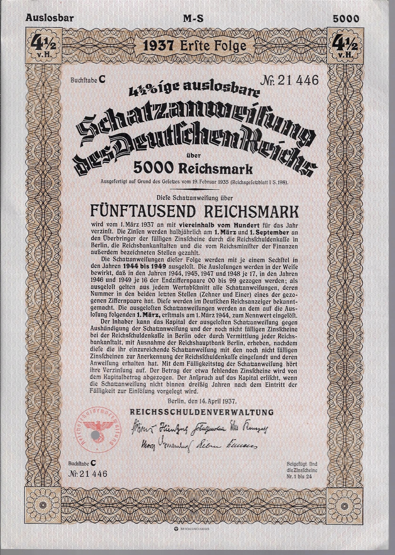 Германия Третий Рейх Скатзанвейсунг 1937 г. Действие / Бонд