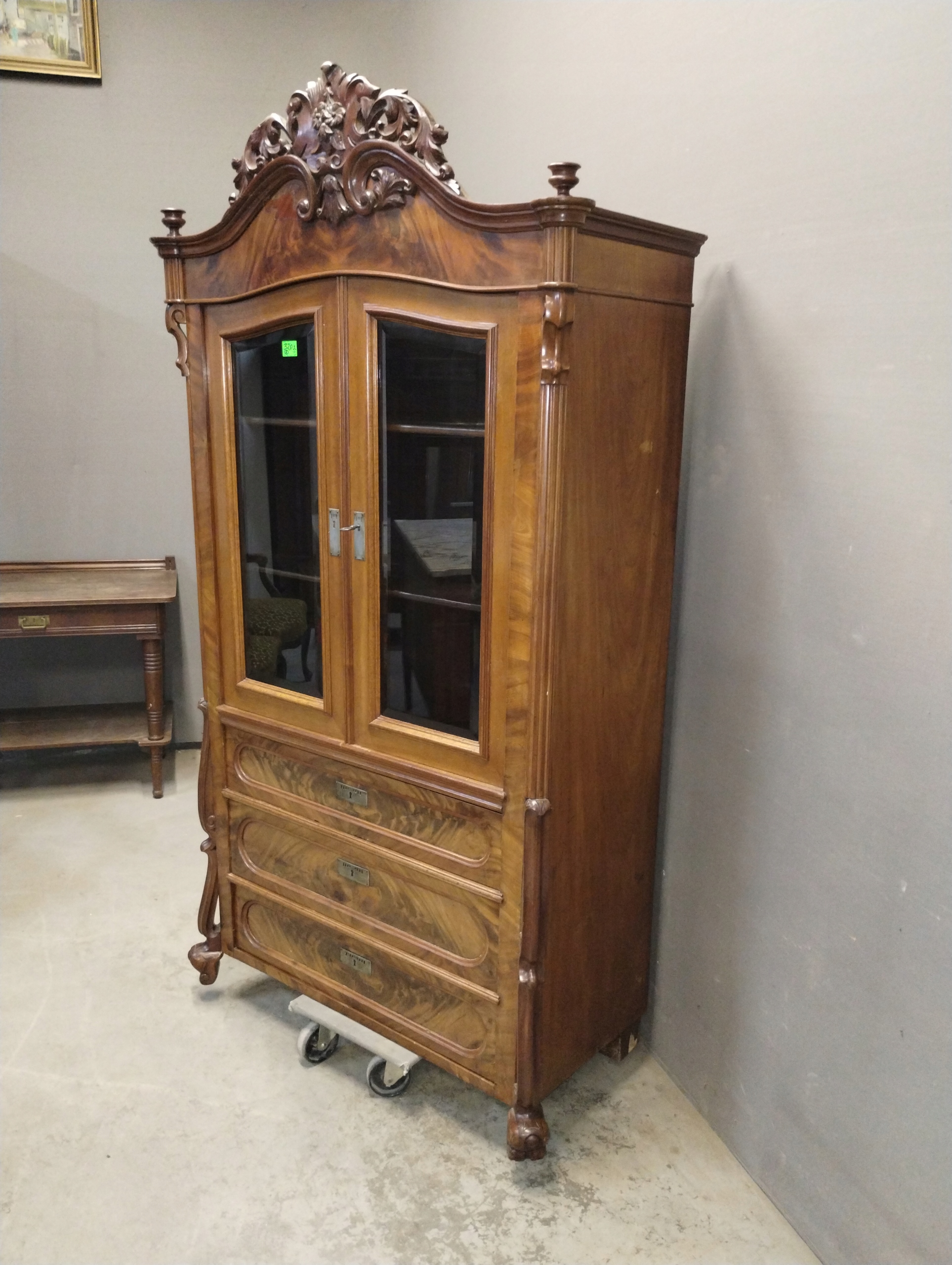 Посуда Людвика Филипа примерно 1860 года представляет собой уникальный предмет мебели из красного дерева, сохранившийся в хорошем состоянии. Явные следы ремонта свидетельствуют о том, что когда-то он был отремонтирован, и кто-то решил установить хрустальные окна, заменив оригинальные из обычного стекла.
