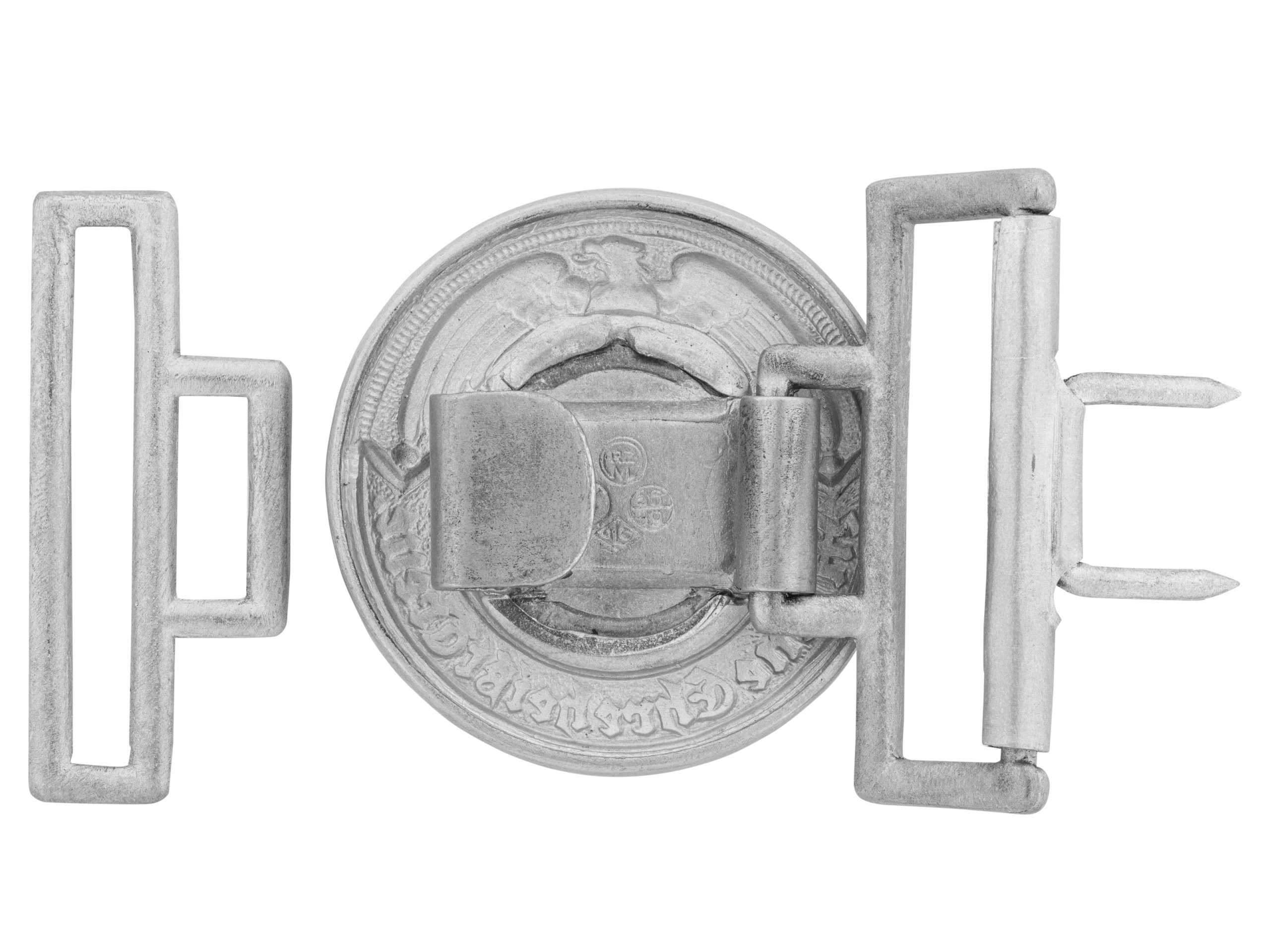 Реплика пряжки офицерского ремня СС. Пряжка изготовлена из алюминия с большим вниманием к деталям, имеет крючок для вшивания в ремень.