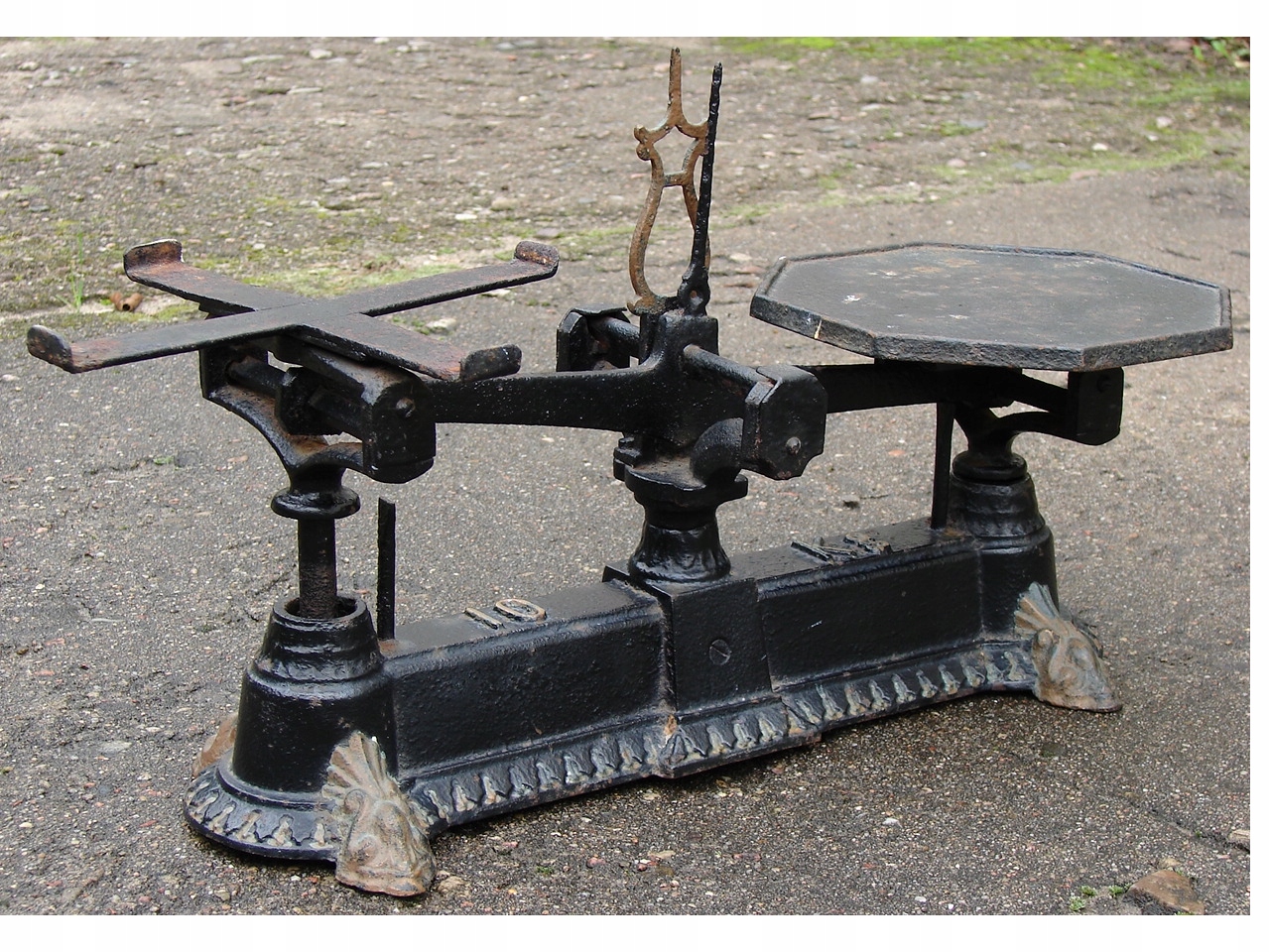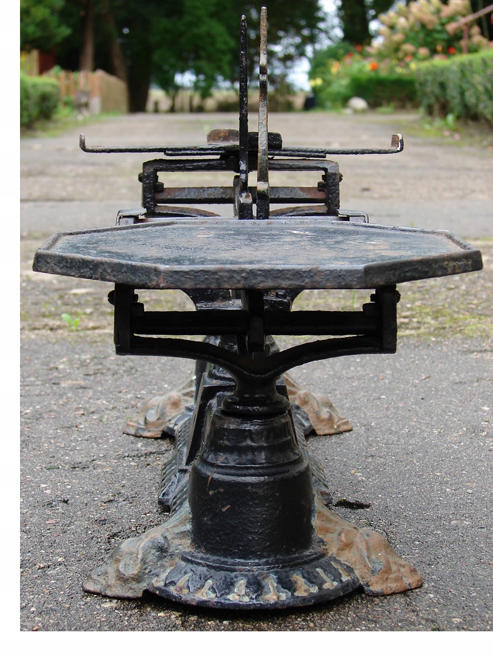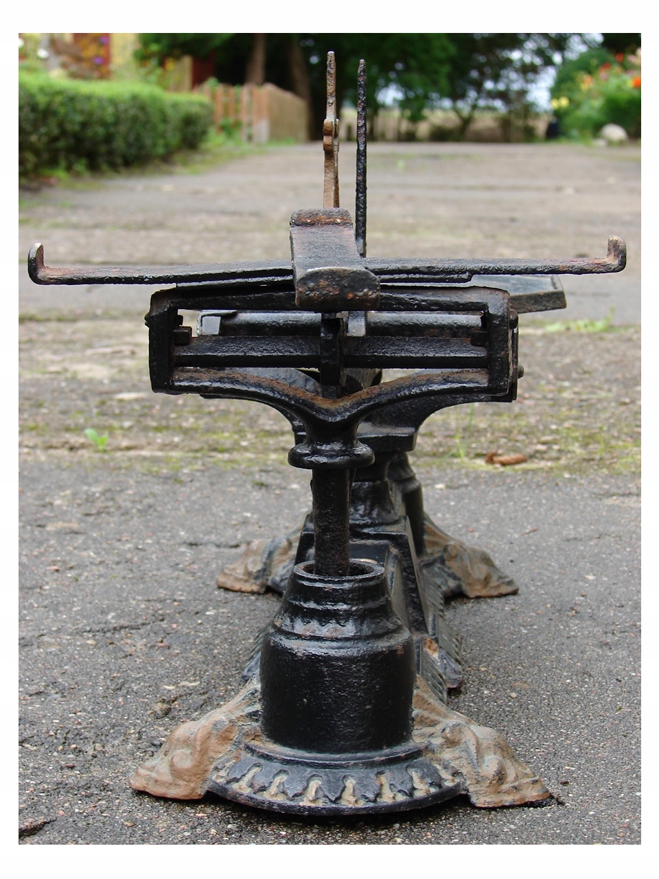 Вес имеет богато украшенную основу из чугуна, характеризующегося растительными мотивами, напоминающими листья аканты стилизованные лапы.