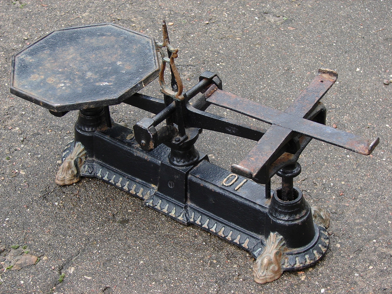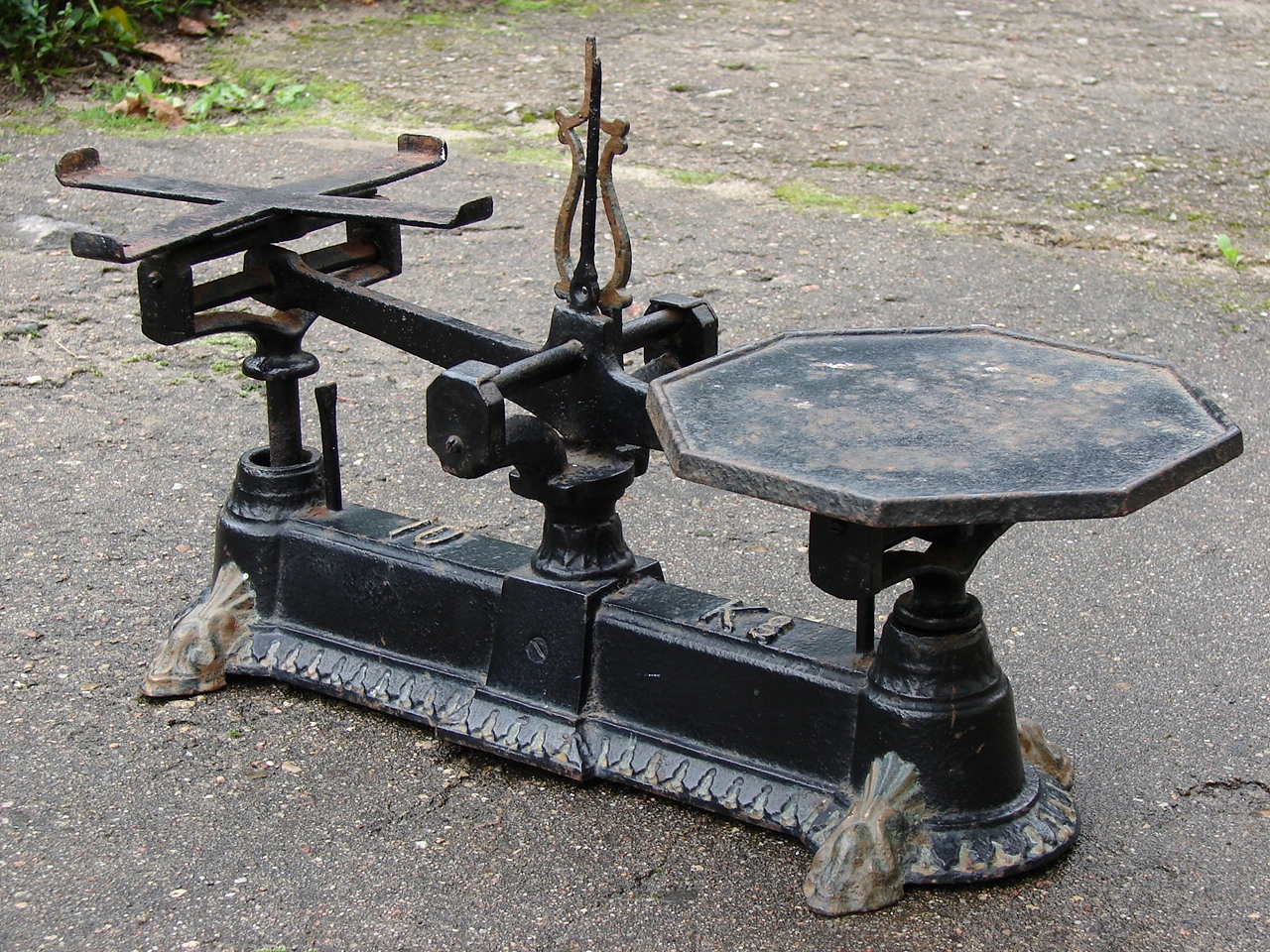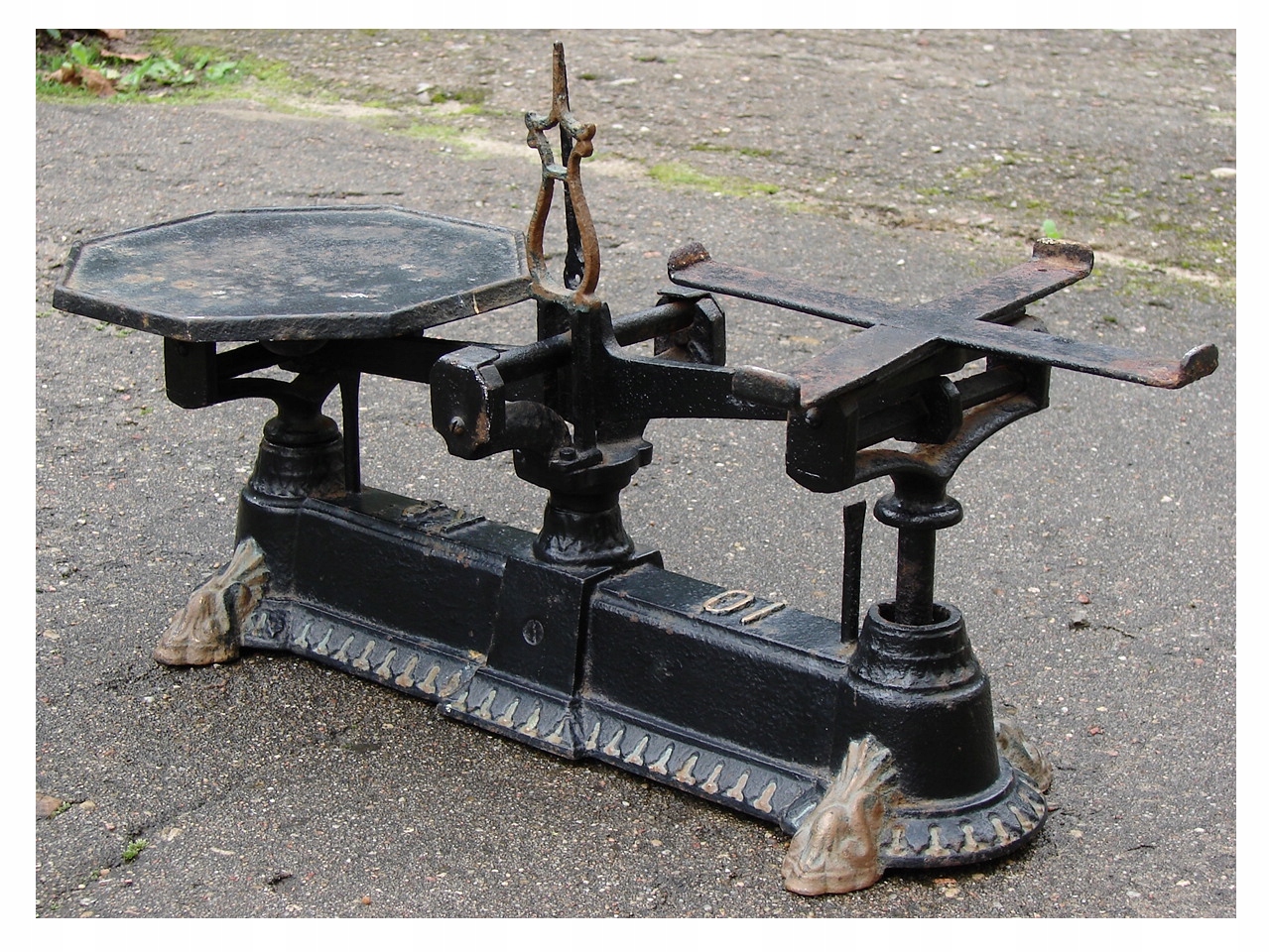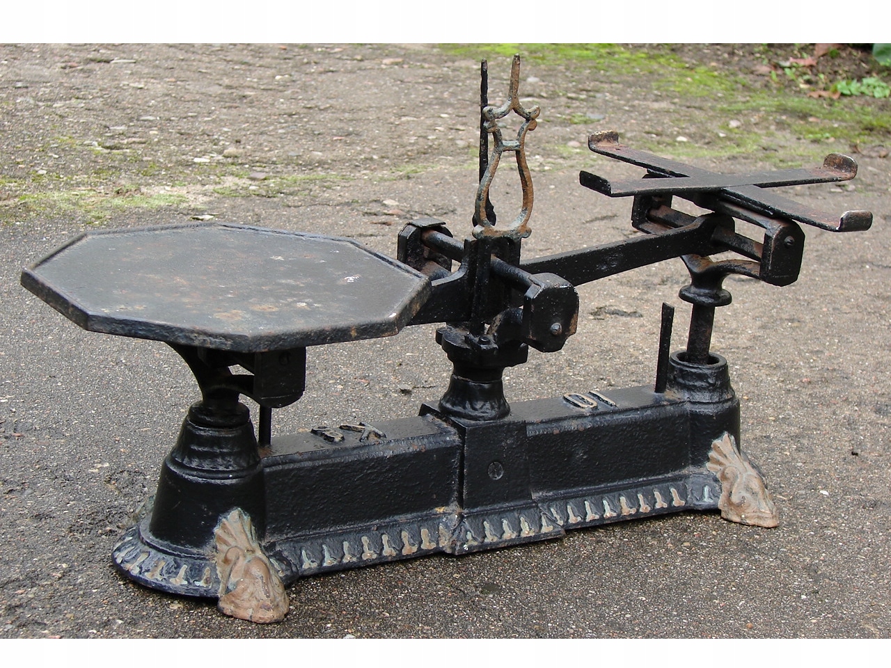 Вес имеет богато украшенную основу из чугуна, характеризующегося растительными мотивами, напоминающими листья аканты стилизованные лапы.