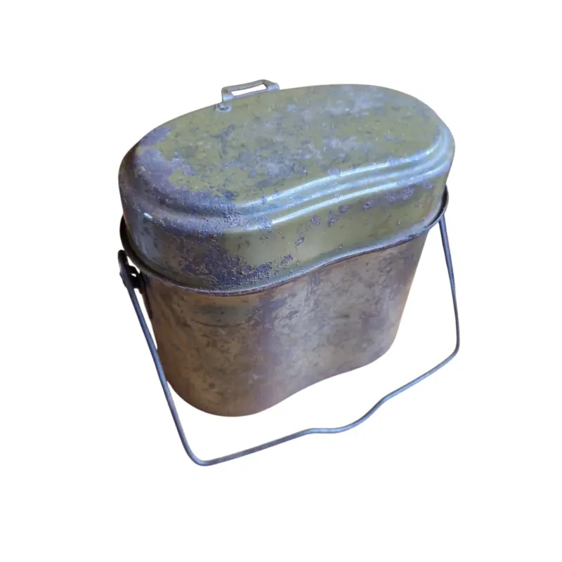 Немецкая стальная фляга RBNR конца войны, фляга из стали, дно фляги посередине оригинального красного цвета (мини/подложка), подпись WJ 43, верх фляги в прекрасном состоянии, маркирован кодом rbnr 0/0571/0116, возраст 44 года, по словам первоначального владельца, вот так столовая нашлась. хорошо сохранившийся набор, дополняющий коллекцию