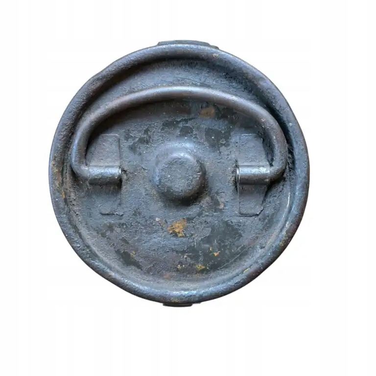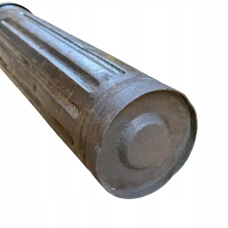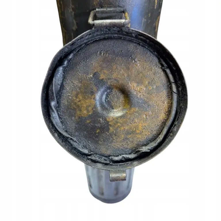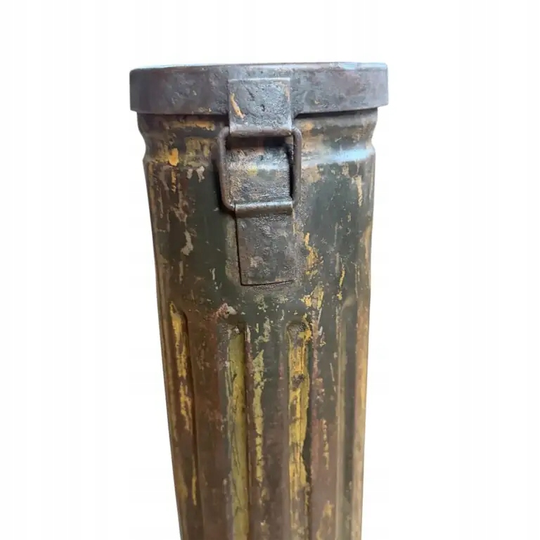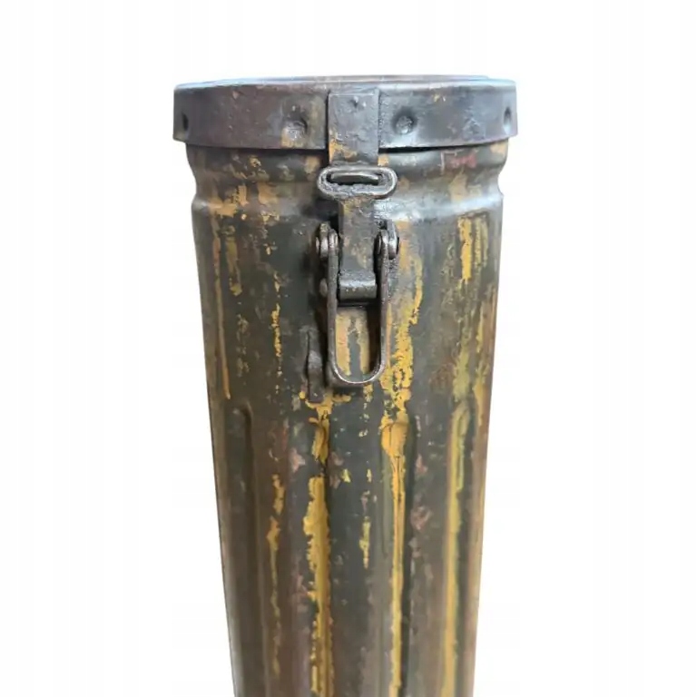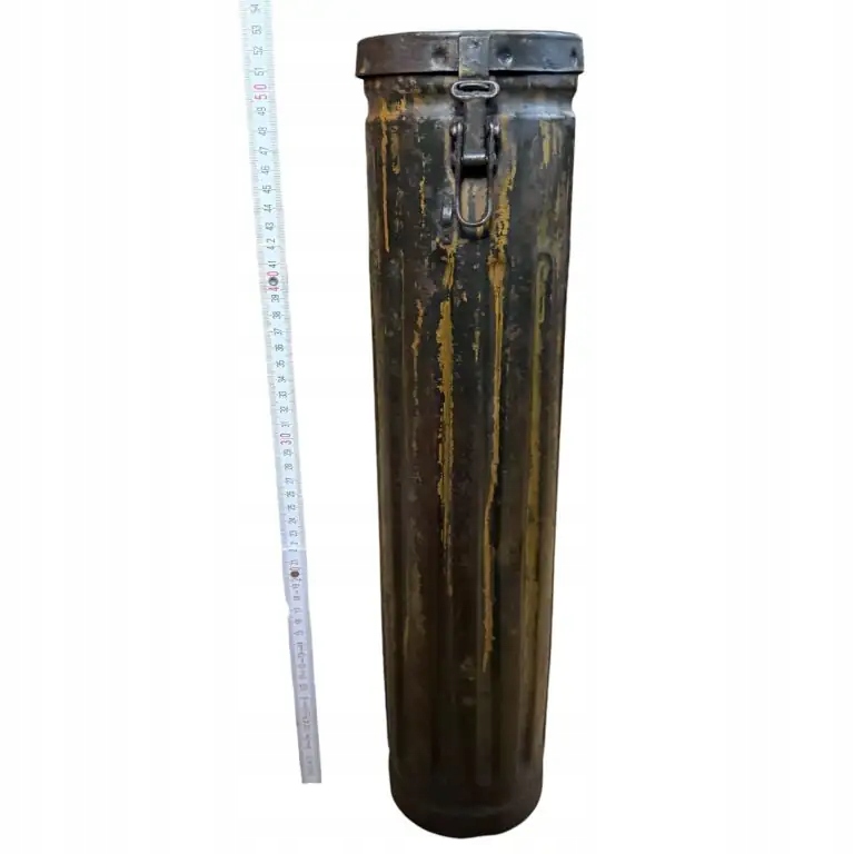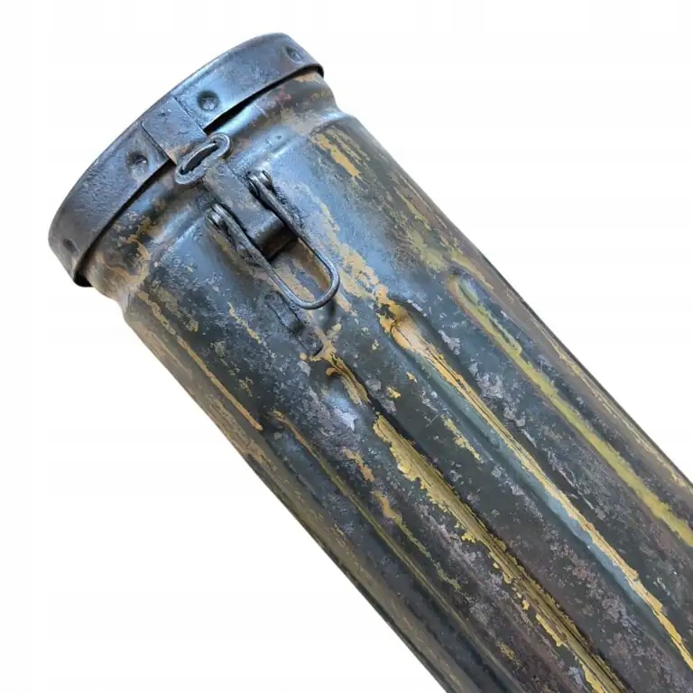 Немецкий тубус для пули Nebelwerfer 40 10 см, рукоятка и застежка в рабочем состоянии, остальная часть пломбы сохранилась, без дыр, сохранилась немецкая зеленая краска «фельдграу» и немного немецкой желтой краски «Дункельбельг» (вероятно, наполовину перекрашенная), а также остатки чернильной маркировки на тубе, очень хорошее состояние для коллекции полировки. Высота 53 см, ширина 13 см