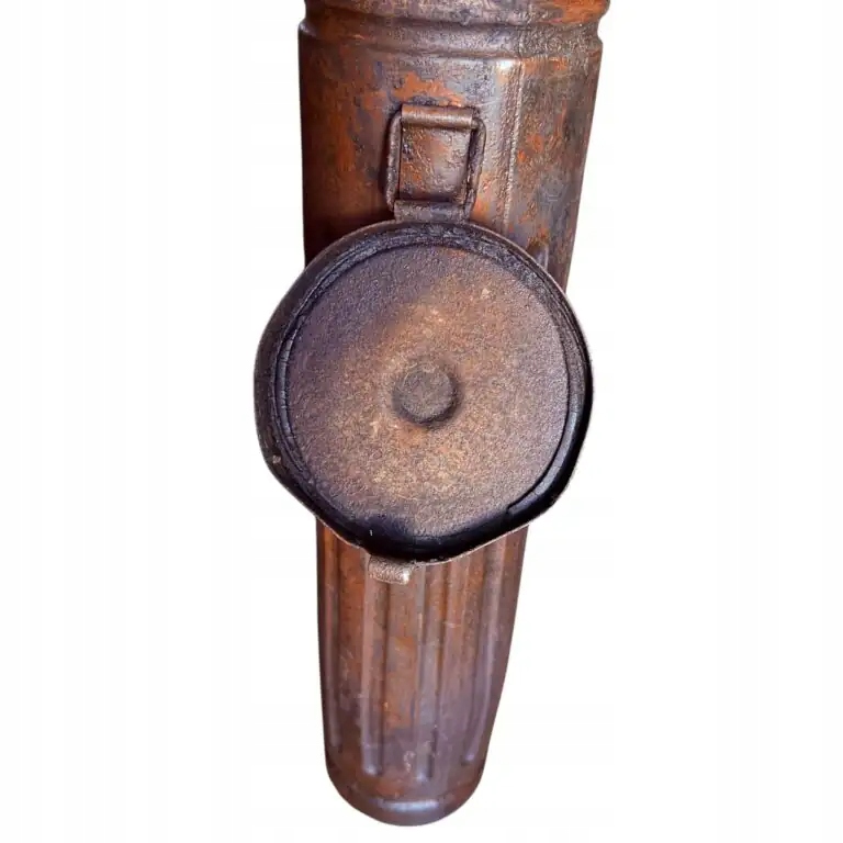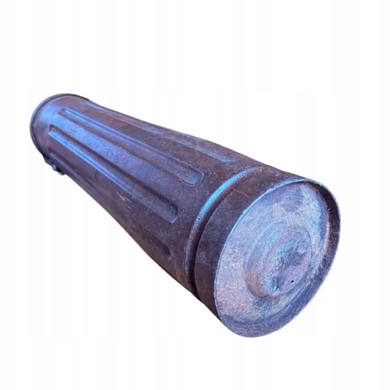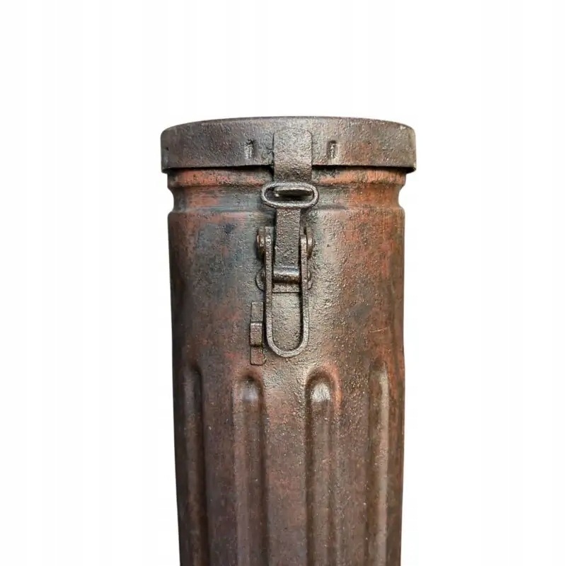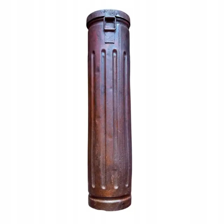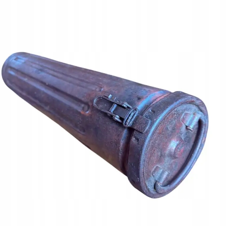 Немецкий тубус для пули Nebelwerfer 40 длиной 10 см, рукоятка и застежка в рабочем состоянии, пломба сохранилась, одно крошечное отверстие внизу, но на практике почти незаметное, немецкая панцерграуская краска сохранилась в небольшом объеме, намного больше сохранилась красная немецкая мини-подкраска на большей части тубуса, очень хорошее состояние для полировки коллекции. Высота 53 см, ширина 13 см