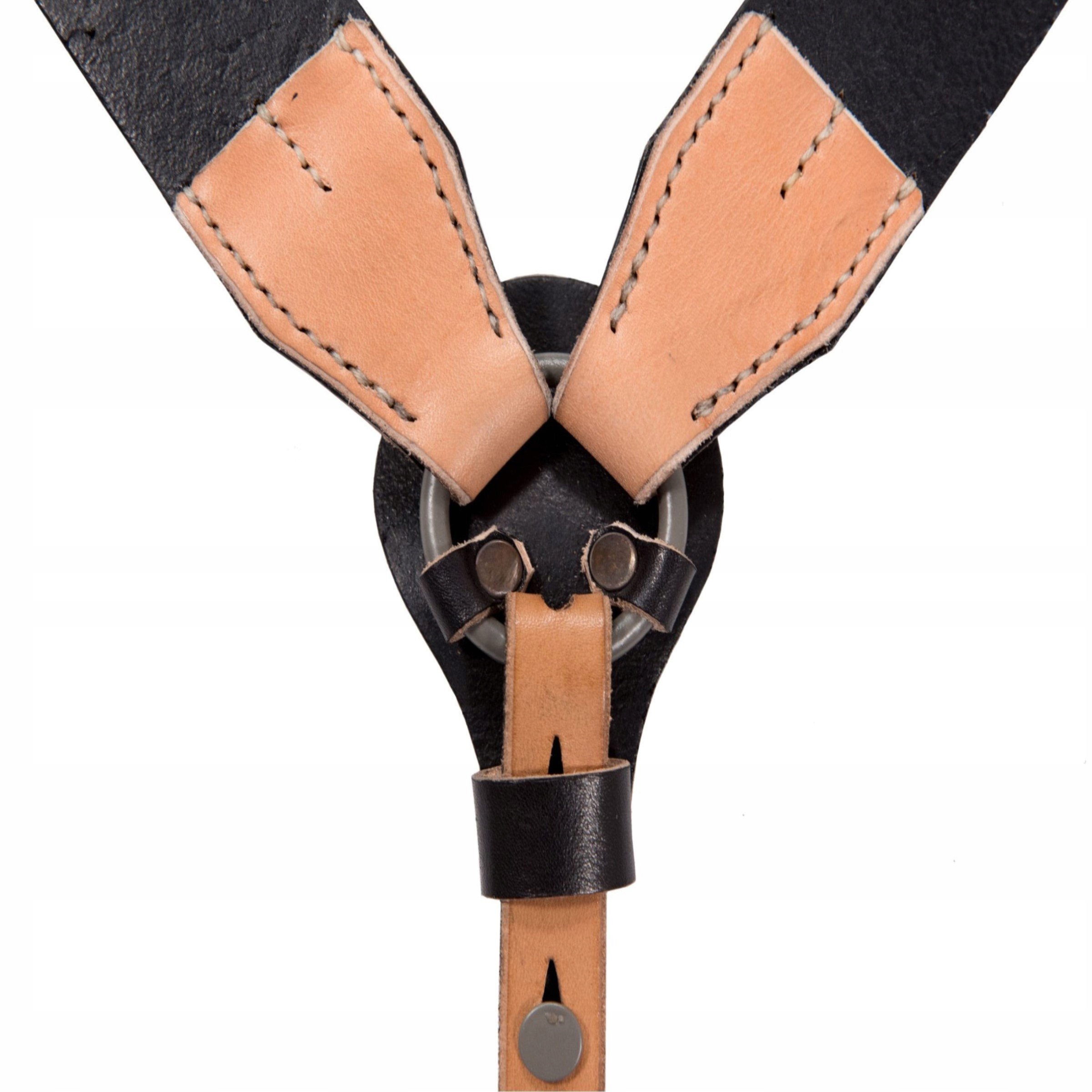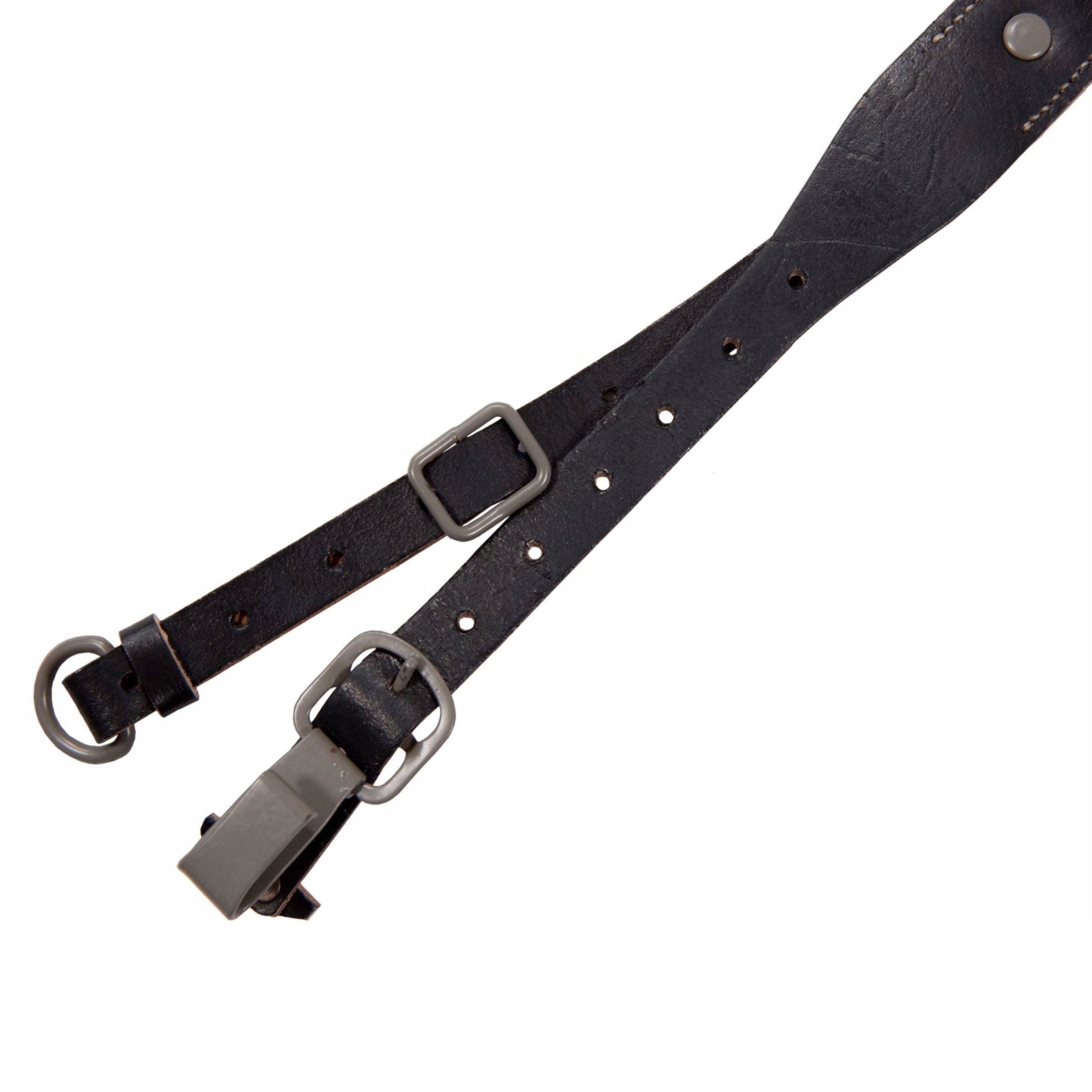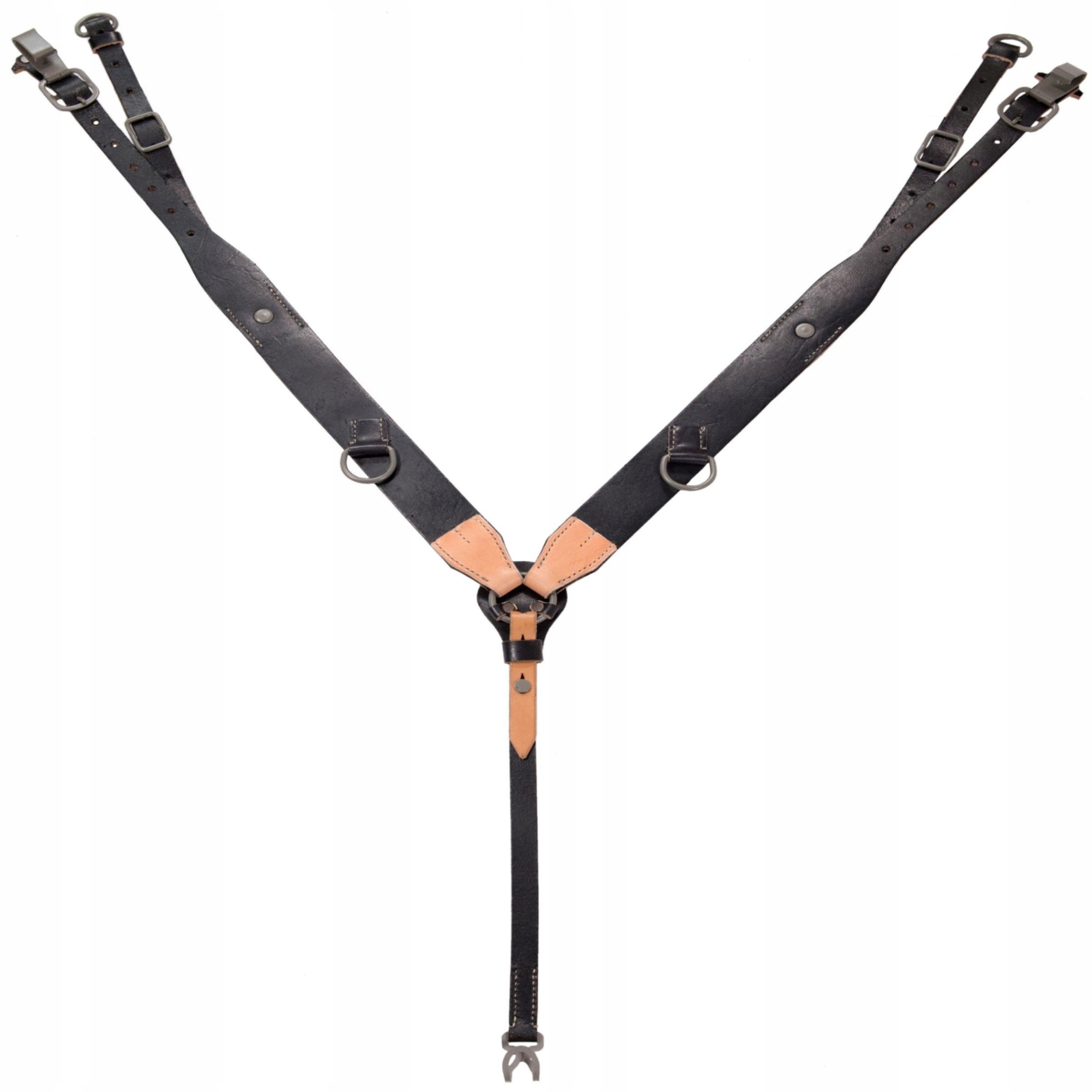 Точная копия немецких боевых подтяжек поздней версии с клепаными деталями. Изготовлен из плотной и плотной кожи растительного дубления. Окрашены в черный цвет и защищены от истирания. Точная копия оригинала. Стальные крючки и фурнитура, окрашенные в нужный цвет. Прошит вручную вощеной нитью. На основных бретелях виден шов, задняя бретелька упрощена проволочным крючком. Верно с 1943 года. На упряжи имеются копии оригинальных штампов и кнопиков, с помощью которых регулируются упряжи.