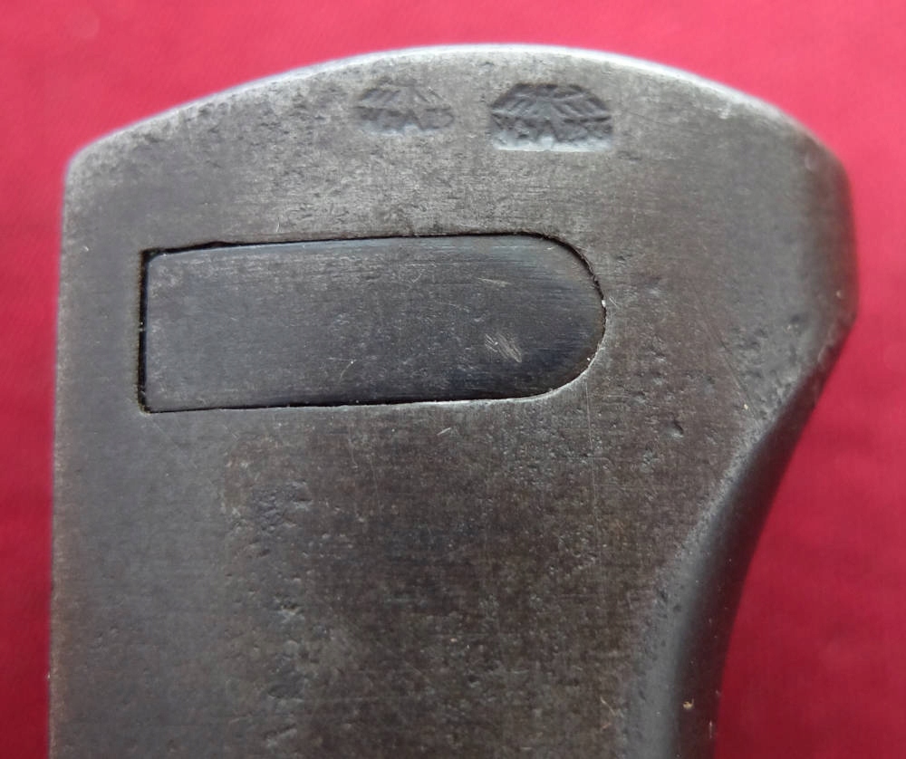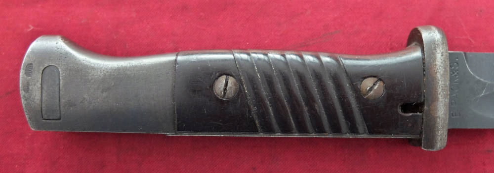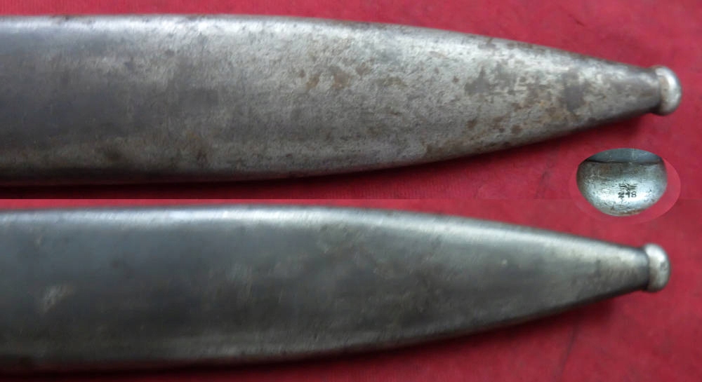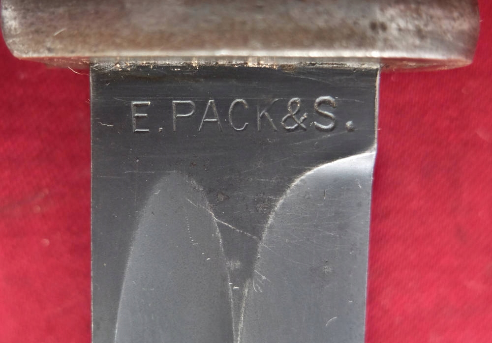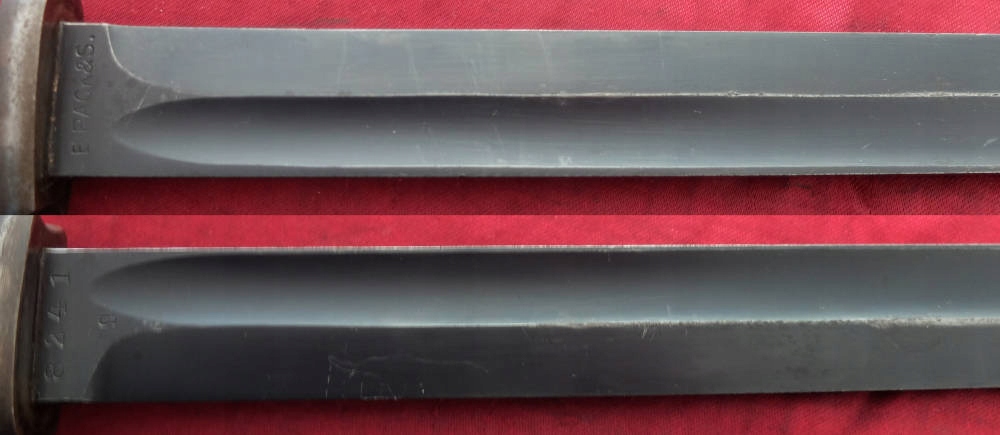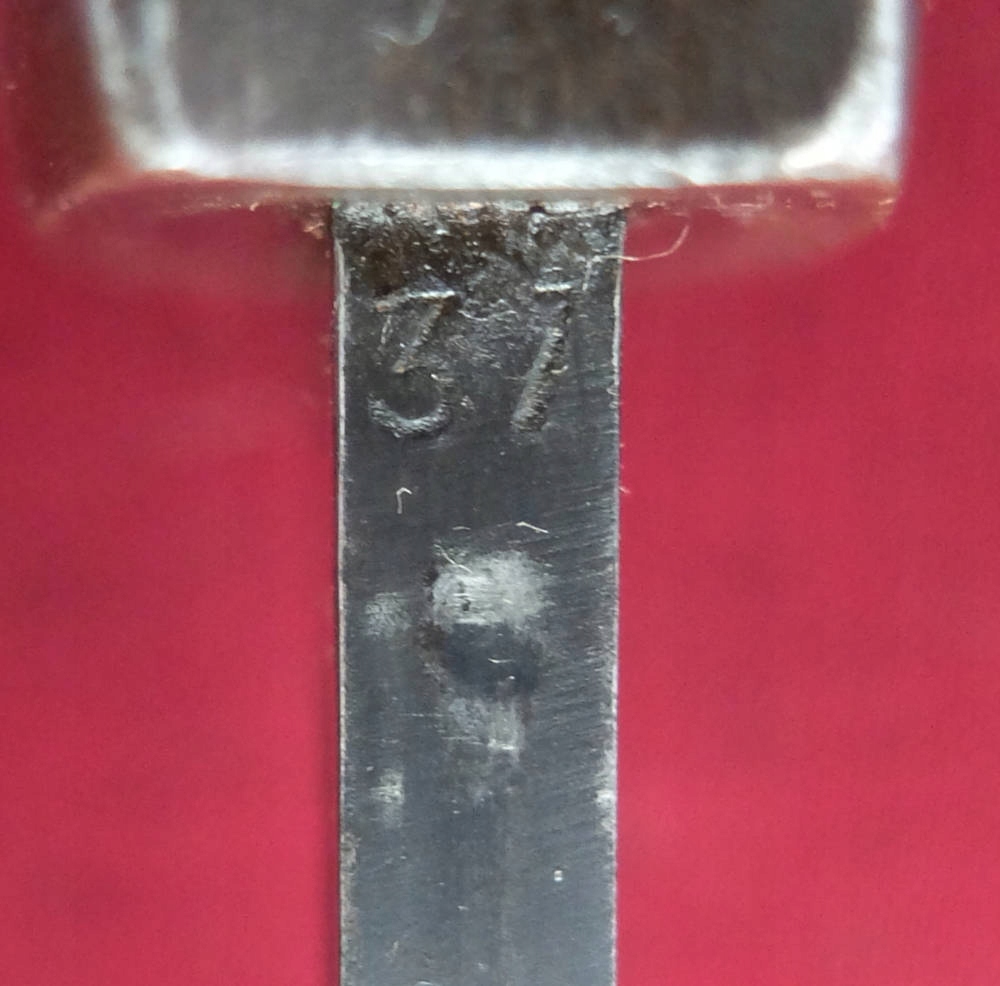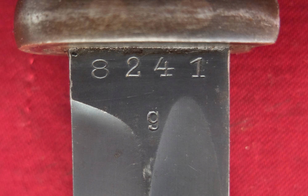 Копия видна на фотографиях , очень хорошо сохранилась. Лезвие не заточено и не заточено, имеет оригинальное оксидное покрытие и слегка потерто от направляющей ножен. На краю лезвия имеется клеймо производителя E.PACK&S., на другой стороне номер 8241 г. На тыльной стороне клинка год 1937. Накладки рукоятки - оригинальный эбонит. Байонетный замок рабочий. На навершии и цевье выштампованы знаки Ваффен.