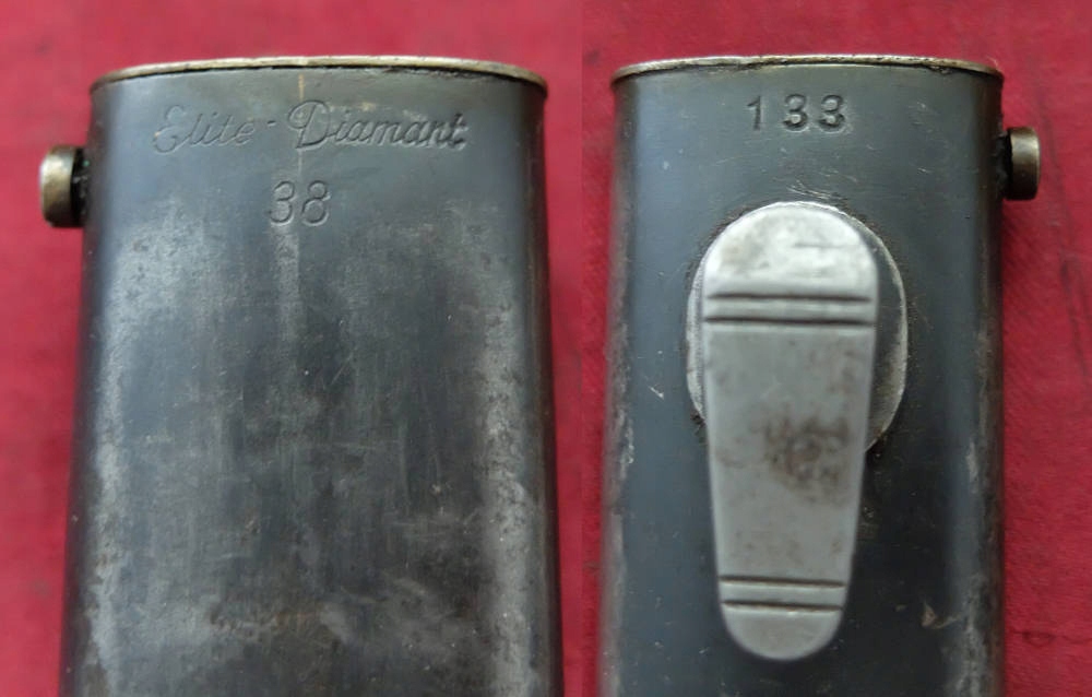 Ножны не имеют отверстий, не мяты, имеют лишь незначительные вмятины. Первоначальное оксидирование частично сохранилось, но сильно изношено. Направляющая ножен функциональна и хорошо удерживает лезвие. На входном отверстии выбита маркировка Elite Diamant 38 и цифра 133.