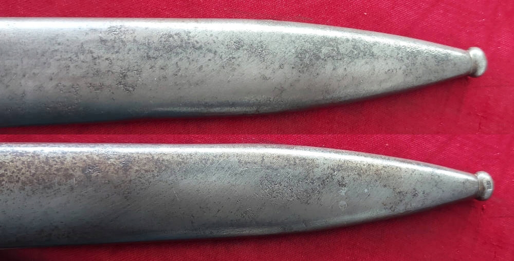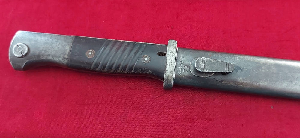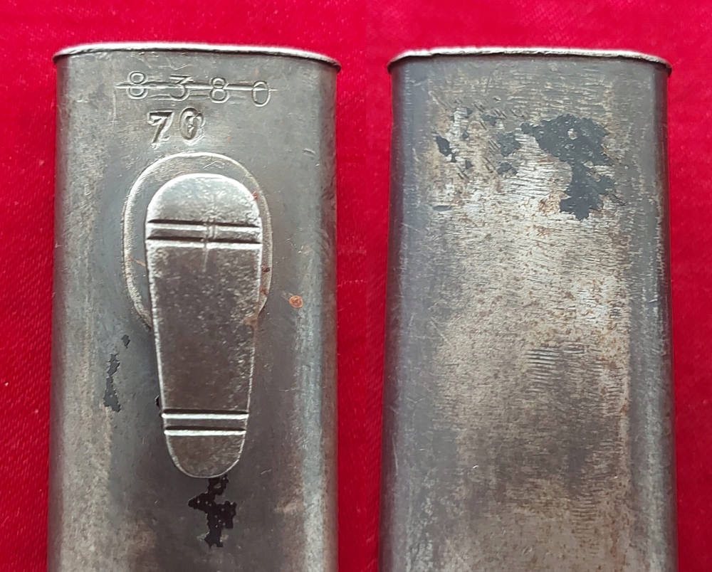 Ножны не имеют отверстий и не мнутся. У входа можно увидеть перечеркнутый номер 8380 и более поздний штамп 70. На шаре в ножнах выбит знак Waffenamt. На ножнах нет маркировки производителя. Направляющая ножен функциональная, лезвие очень хорошо помещается в ножнах.