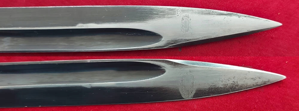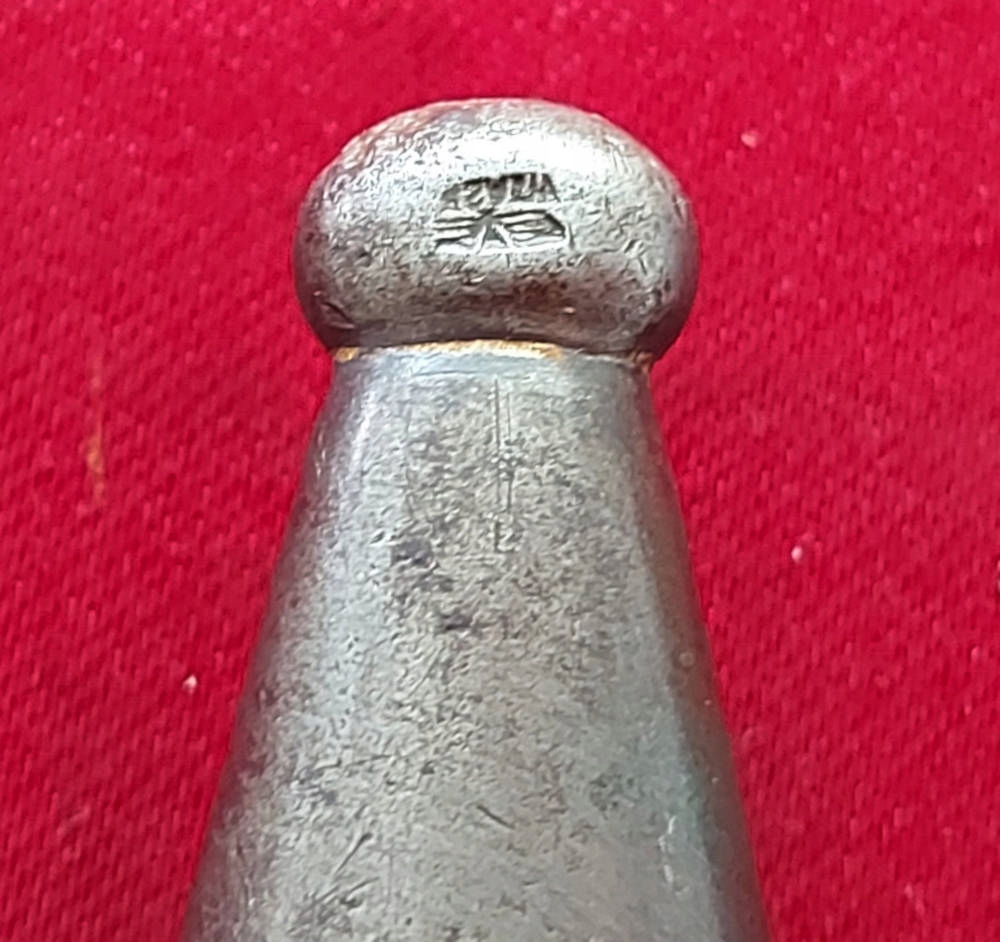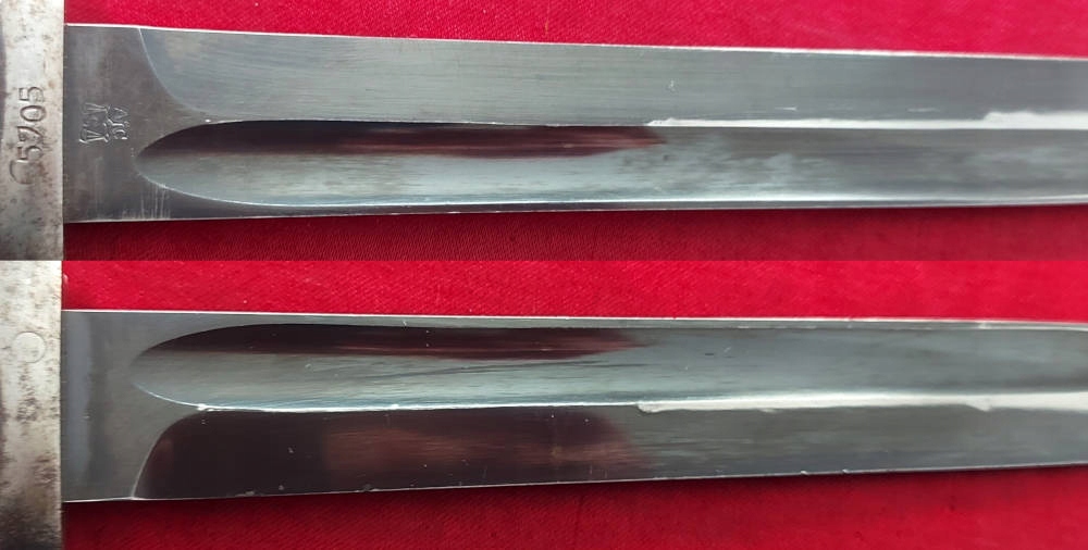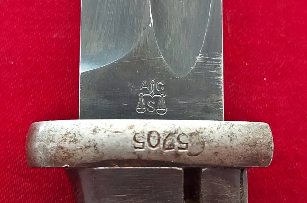 Копия видна на фото. фотографии, очень хорошо сохранились. Лезвие не заточено, не заточено, имеет оригинальное оксидное покрытие, но слегка потерто от направляющей ножен, в основном на лезвии. Упомянутая маркировка A C S с обозначением веса выбита на пороге лопасти. На поперечине выбит номер 5705. Накладки рукоятки - оригинальный эбонит. Байонетный замок работает.