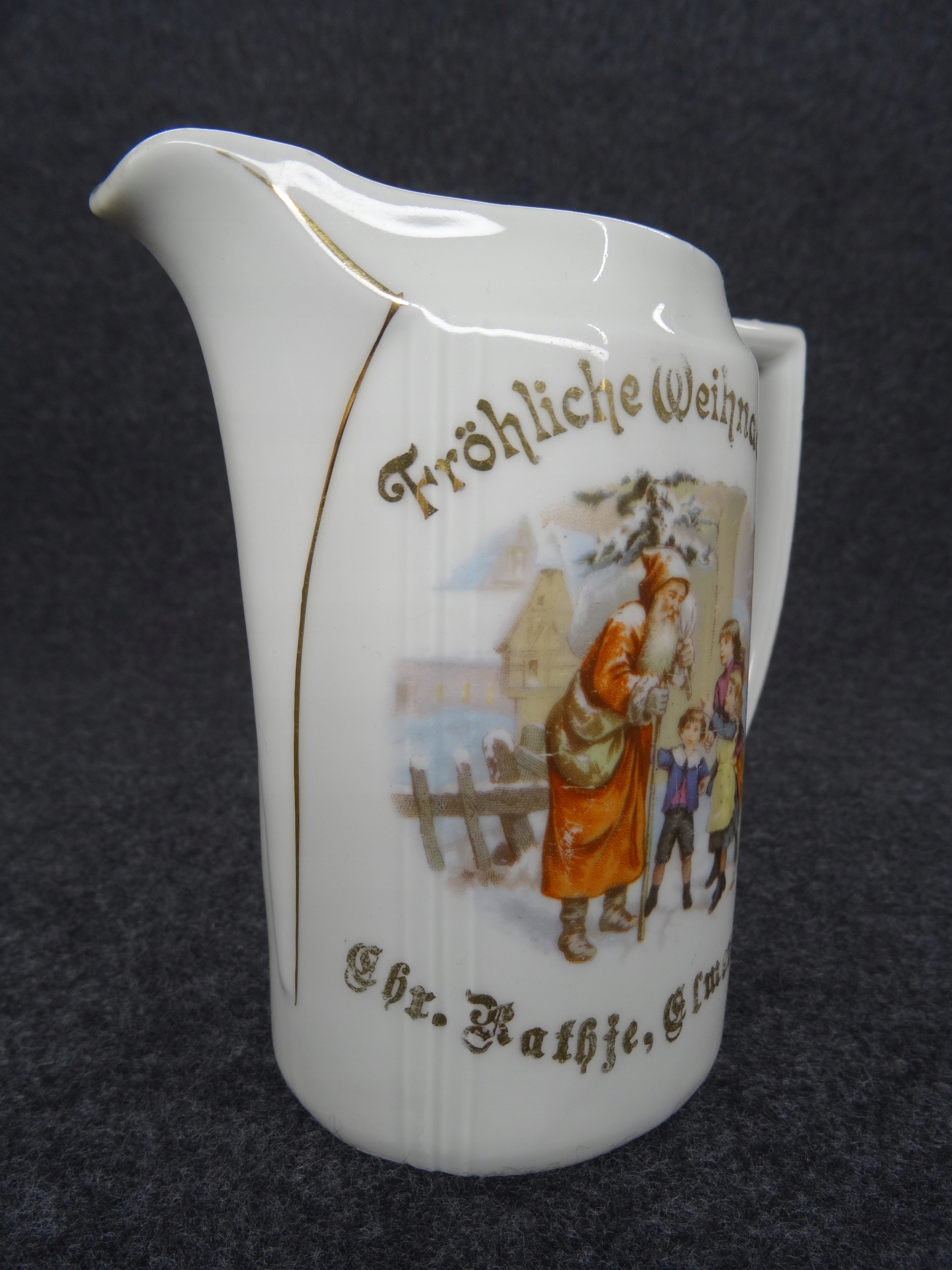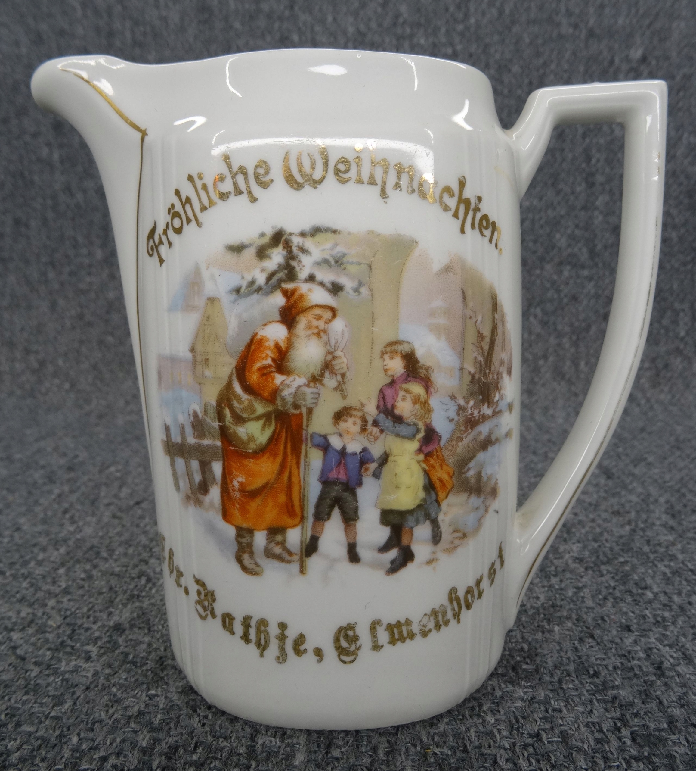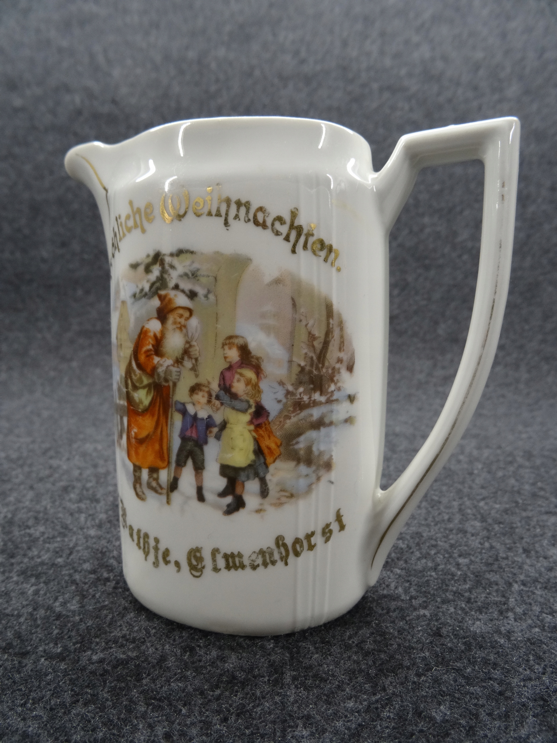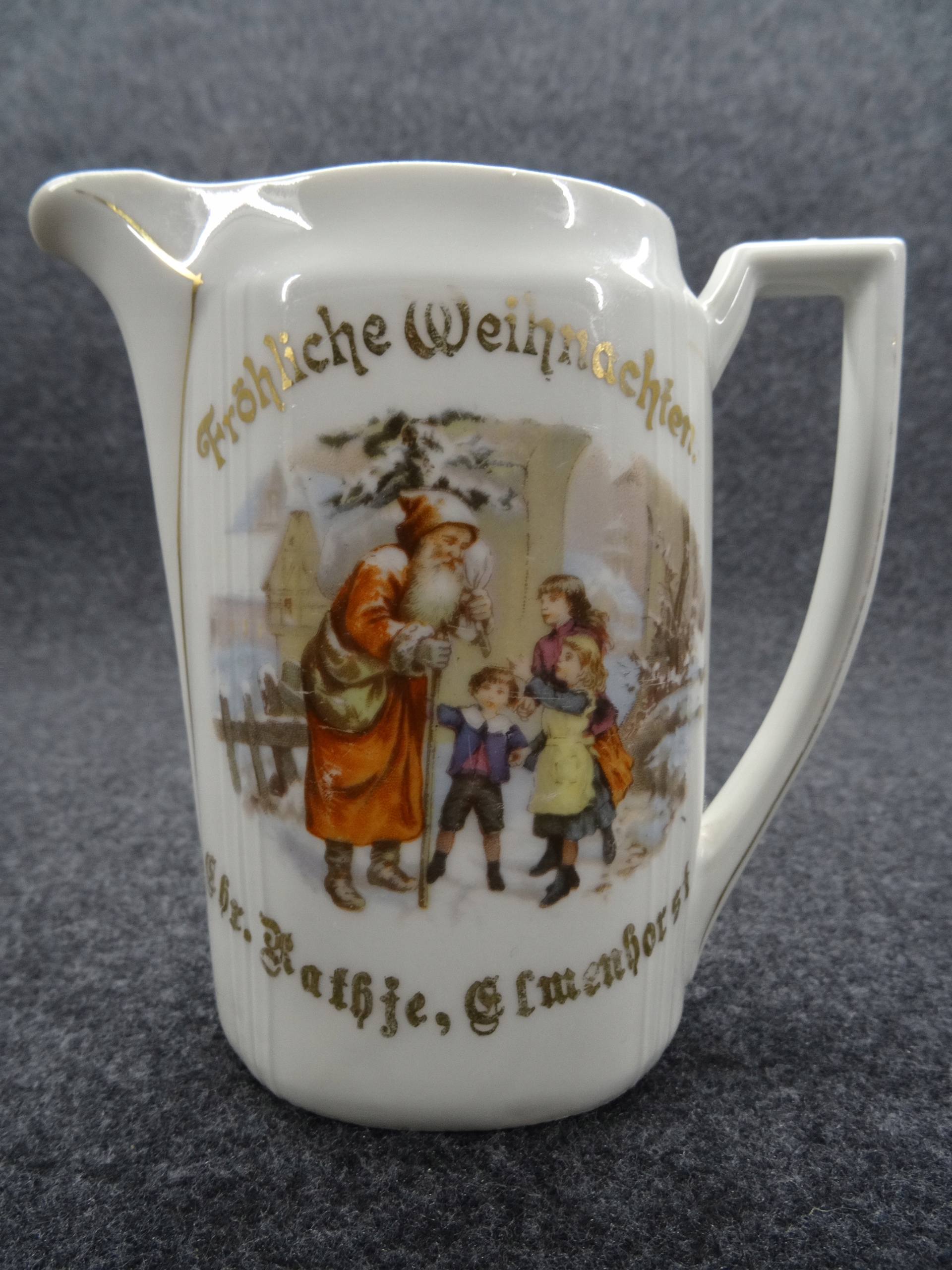 Фарфоровый немецкий довоенный молочник с немецкой надписью по краю: С Рождеством, Дед Мороз с детьми.