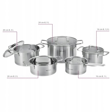 В набор входят 5 кастрюль емкостью 1 литр; 1,5л; 2л; 3л; 5л и 3 крышки диаметром 16см; 20 см и 24 см. Предназначен, в частности, для приготовления соусов, мяса и овощей.