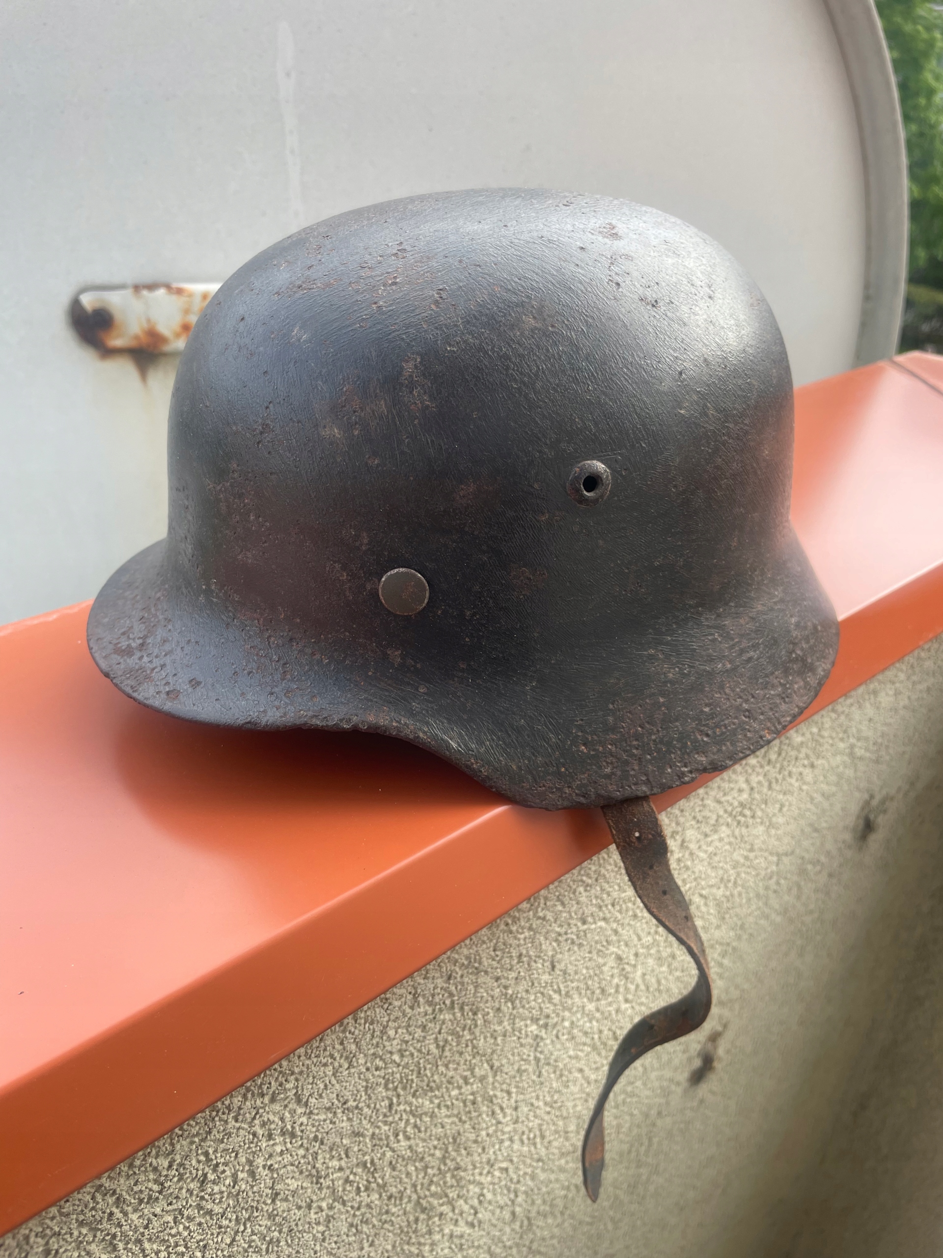Условие немецкого шлема M35, как в фото сотовой связи, сохранившую оригинальную краску. У Халма есть следы точечной коррозии и обладают гибкостью и булавкой.