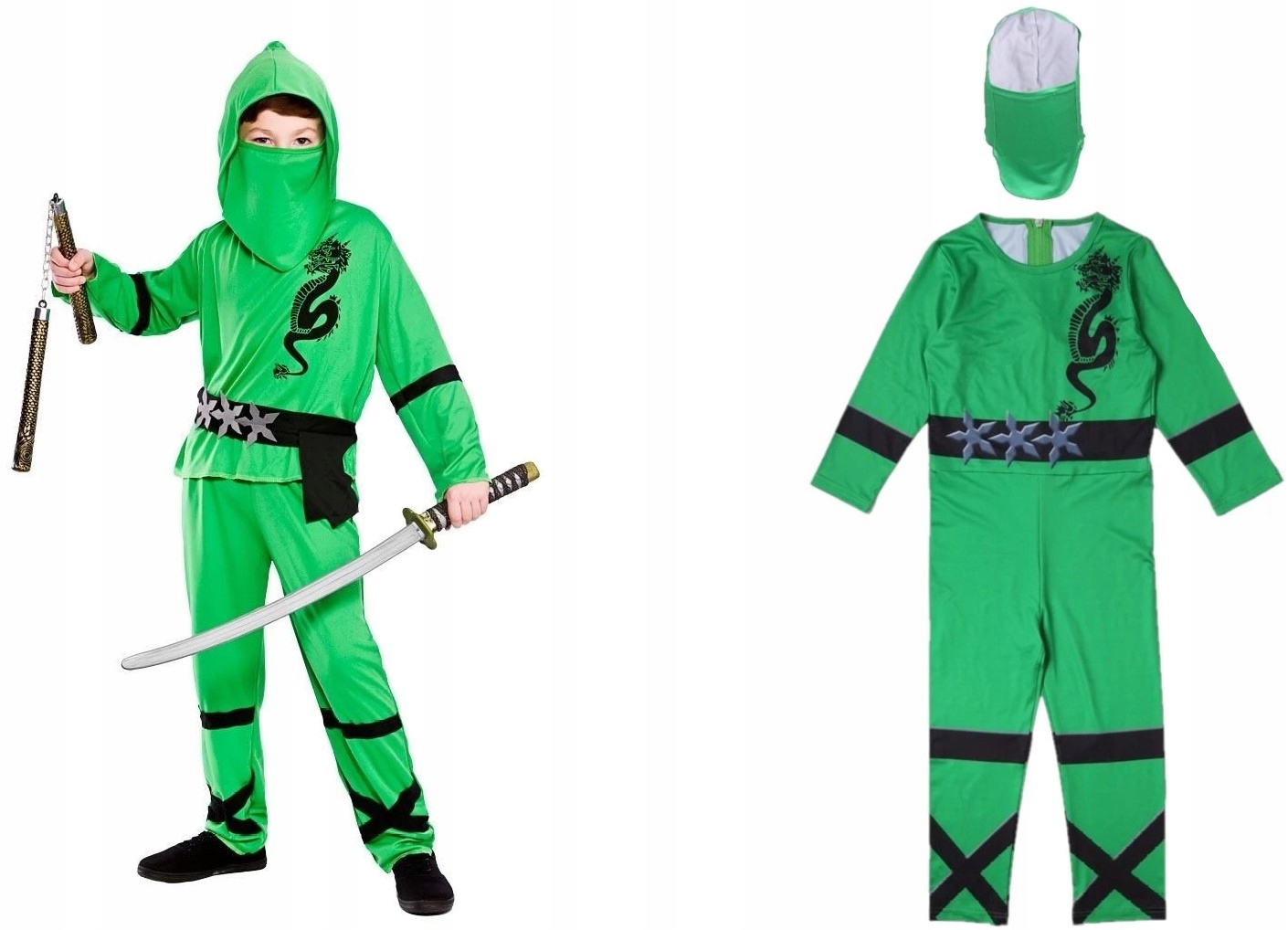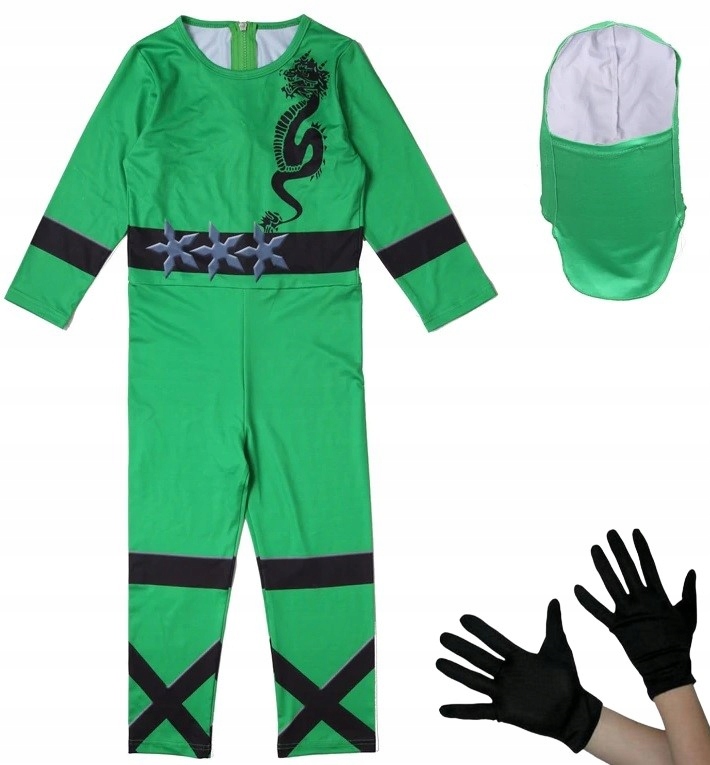 Цельный Костюм ниндзя зеленого цвета с черными элементами. Хорошо сделанный, немного гибкий и подогнанный. Благодаря нашему предложению каждый поклонник воинов-ниндзя превратится в отважного воина с Дальнего Востока. Интересный костюм перенесет ребенка в мир комиксов и сказок, который надолго сохранит в памяти детство.