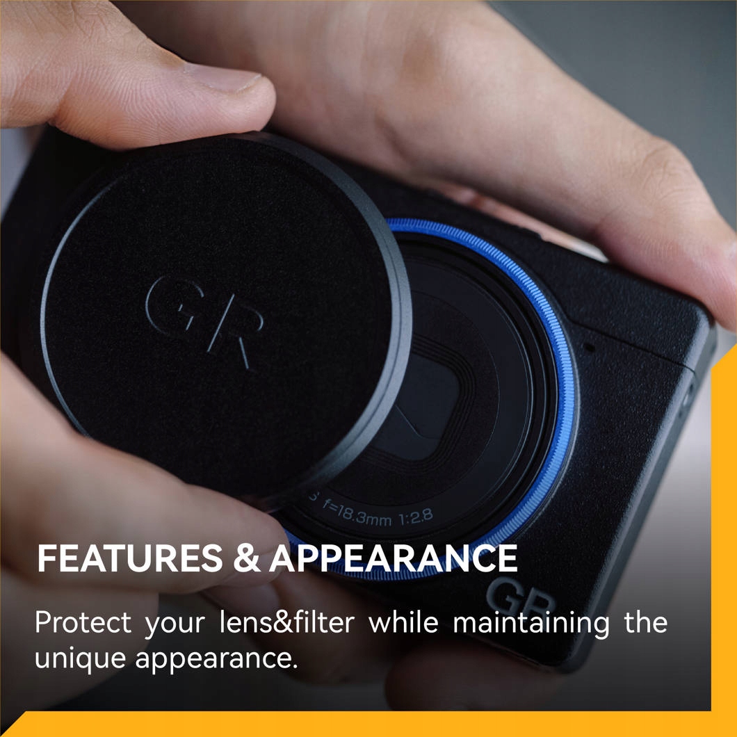 Комплект NiSi Ring+Cap — это специально разработанный комплект для камеры Ricoh GR IV, который заменяет стандартное кольцо объектива и добавляет практичный защитный чехол. Кольцо легко устанавливается путем откручивания заводского элемента и вкручивания кольца NiSi – без необходимости использования инструментов. В комплект также входит соответствующая крышка, которая защищает переднюю часть объектива от грязи и повреждений при переноске камеры.
